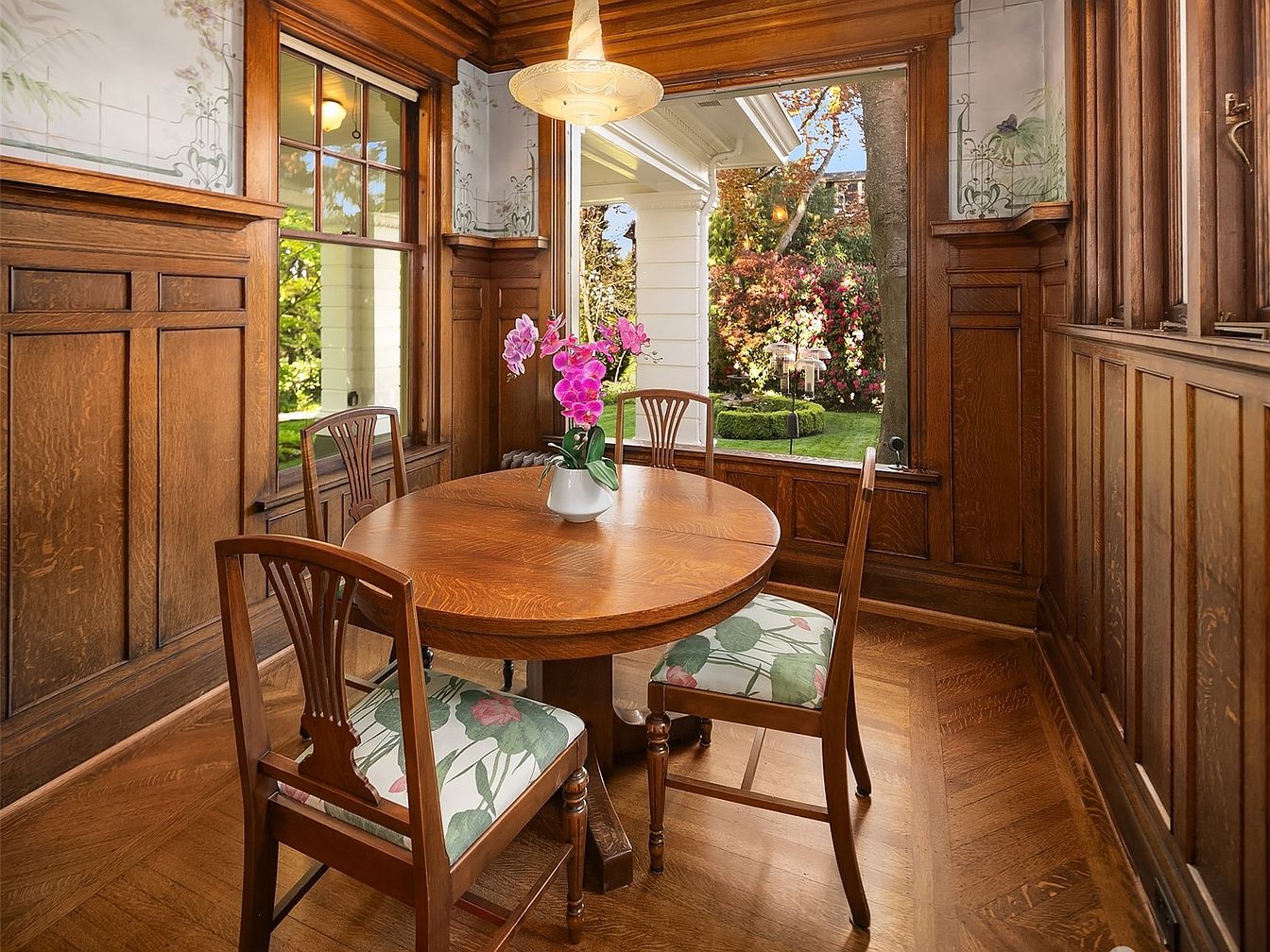 Tucked beside large windows with a view of the lush garden, this breakfast nook makes an inviting spot for family meals. Warm wood paneling wraps the room, blending seamlessly with the period detailing of the window trim. An oval table with floral-upholstered chairs provides comfortable seating for four, perfect for busy mornings or afternoon snacks. Neutral tones and natural wood grain give the space a cozy, timeless charm. Overhead, a vintage-inspired pendant light adds a soft glow. The view of the manicured backyard connects the interior to outdoor living, creating a delightful gathering place for all ages.