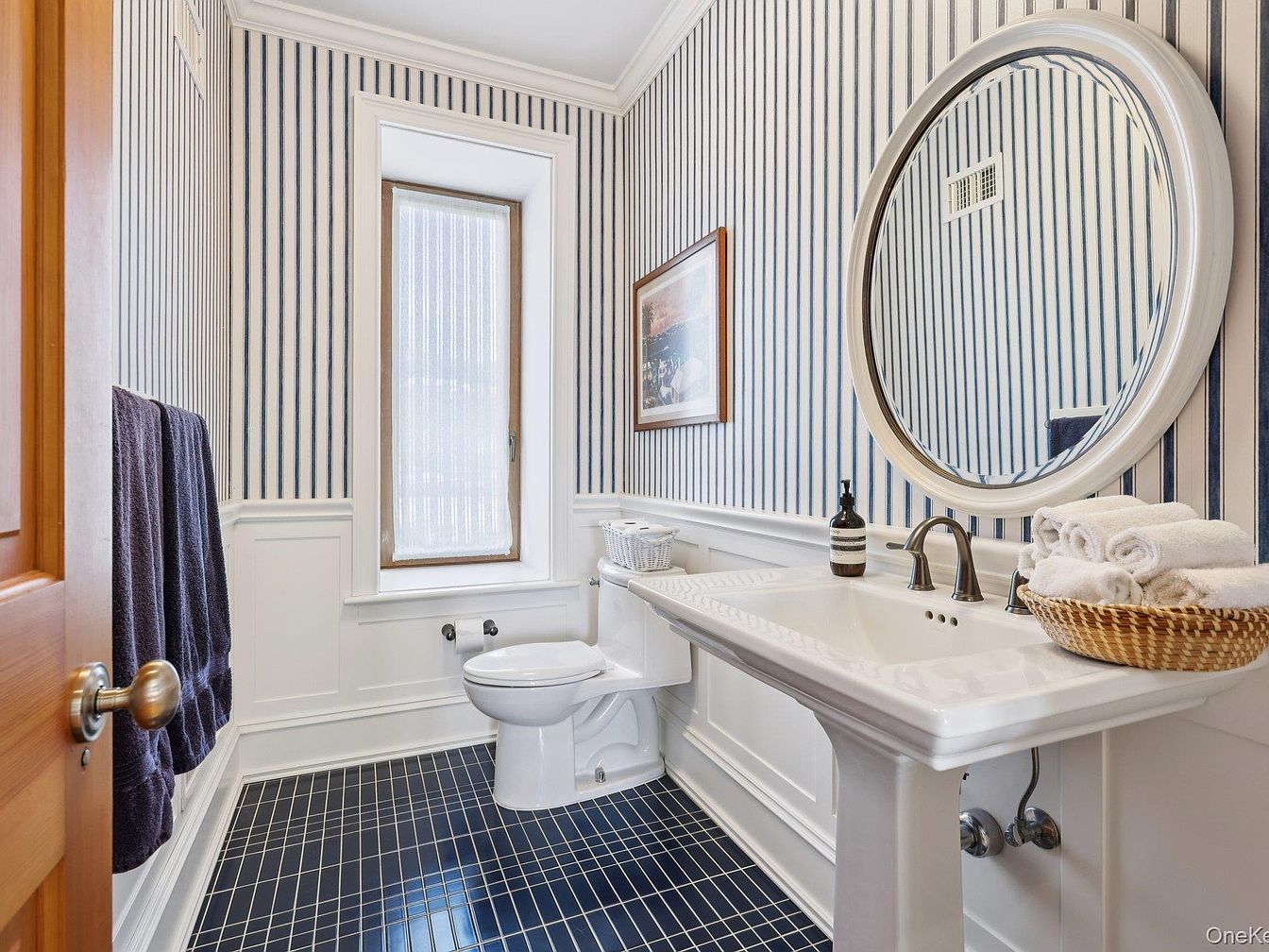 Bright and inviting, this bathroom features traditional design elements with modern touches. The vertical navy and white striped wallpaper is accented by crisp white wainscoting, creating a timeless nautical flair. A large round mirror sits above a classic pedestal sink, which is topped with neatly rolled towels in a wicker basket and a bottle of soap, perfect for family guests. The navy tile floor coordinates with the walls for a cohesive look, while the window brings in natural light. Elegant framed artwork and practical towel hooks ensure the space is both welcoming and functional for families.