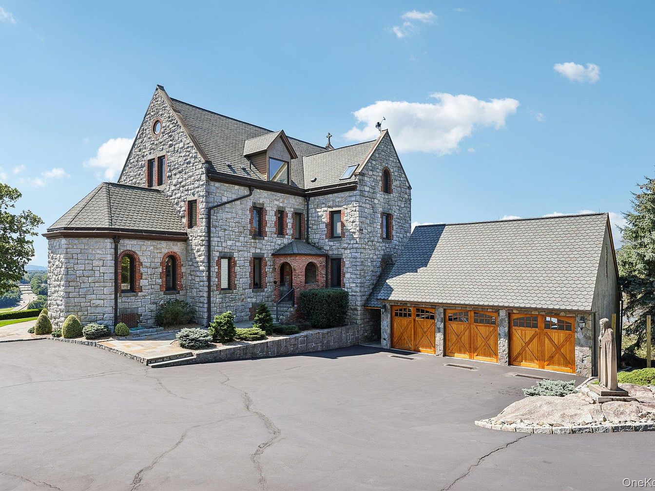 A striking stone façade creates timeless curb appeal, highlighted by a steep slate roof, gables, and arched windows with brick accents that provide both character and warmth. The spacious driveway offers ample parking and easy access to a three-car garage with rustic wooden doors, making it ideal for families with multiple vehicles or guests. Thoughtfully landscaped grounds with trimmed hedges, sculpted bushes, and rock details blend seamlessly with the sturdy architecture. The entryway features a sheltered porch, inviting arrivals while delivering a sense of welcome and security to residents and their visitors. Large windows promise abundant natural light inside the home.
