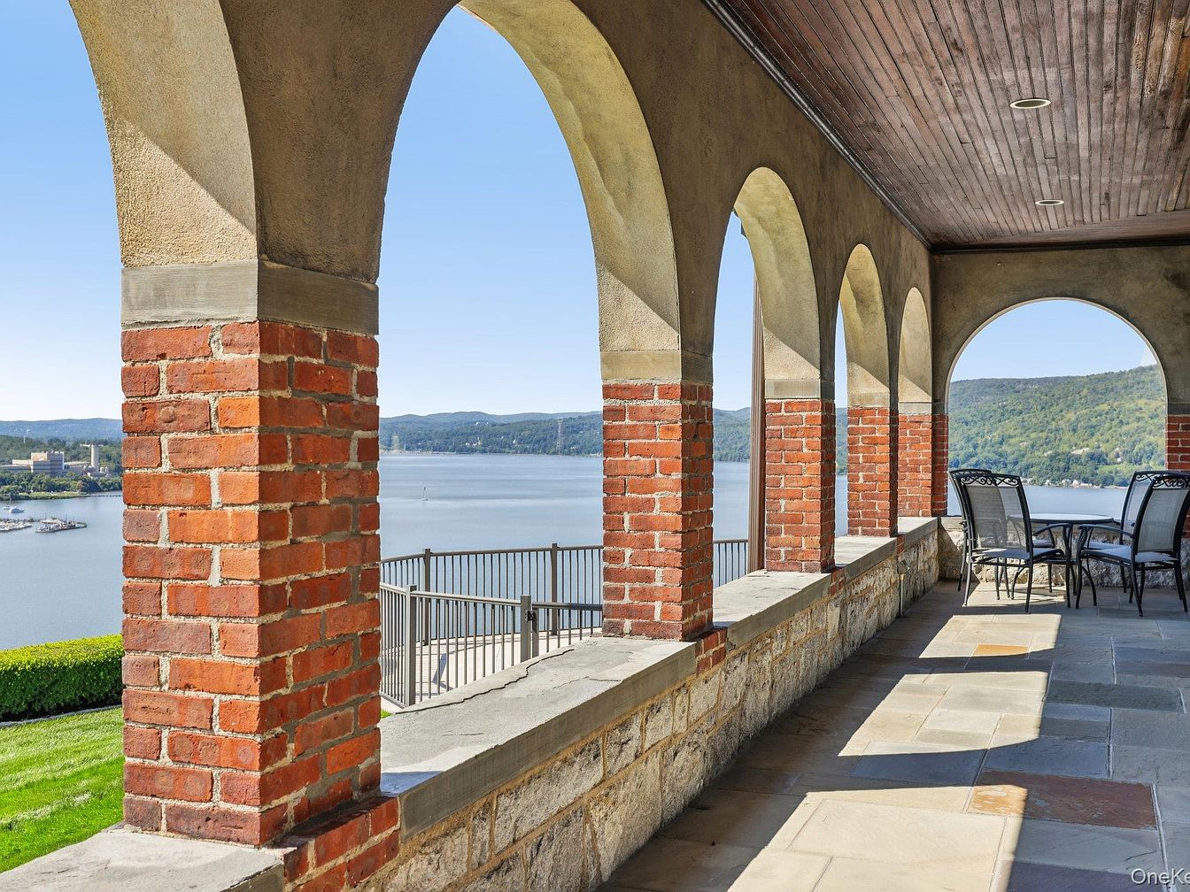 A stunning covered patio features a series of graceful brick and stone arches framing panoramic water and mountain vistas, perfect for enjoying scenic sunsets. The natural stone flooring contrasts beautifully with the warm, textured wood ceiling above, exuding classic charm and durability. An elegant wrought-iron dining set provides a comfortable space for family meals or gatherings, while the expansive layout leaves plenty of room for children to play or explore safely. The earthy color palette and robust architectural elements create an inviting, timeless atmosphere, making this patio an ideal spot for relaxation and hosting friends or family throughout the seasons.