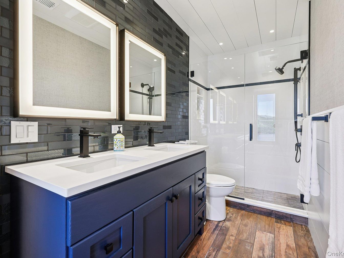 A sleek double-sink vanity with ample storage anchors this modern bathroom, making it perfect for families. Illuminated mirrors complement the deep navy cabinetry and create a bright, welcoming ambiance, while matte black fixtures add a contemporary edge. The dark subway tile accent wall infuses texture and drama, balanced by the crisp white countertop and shiplap ceiling. The large walk-in shower, enclosed with clear glass and featuring a convenient built-in bench, is accessible and spacious enough for busy mornings. Warm wood-look flooring adds a cozy, inviting touch, blending durability with style for an effortless family-friendly retreat.