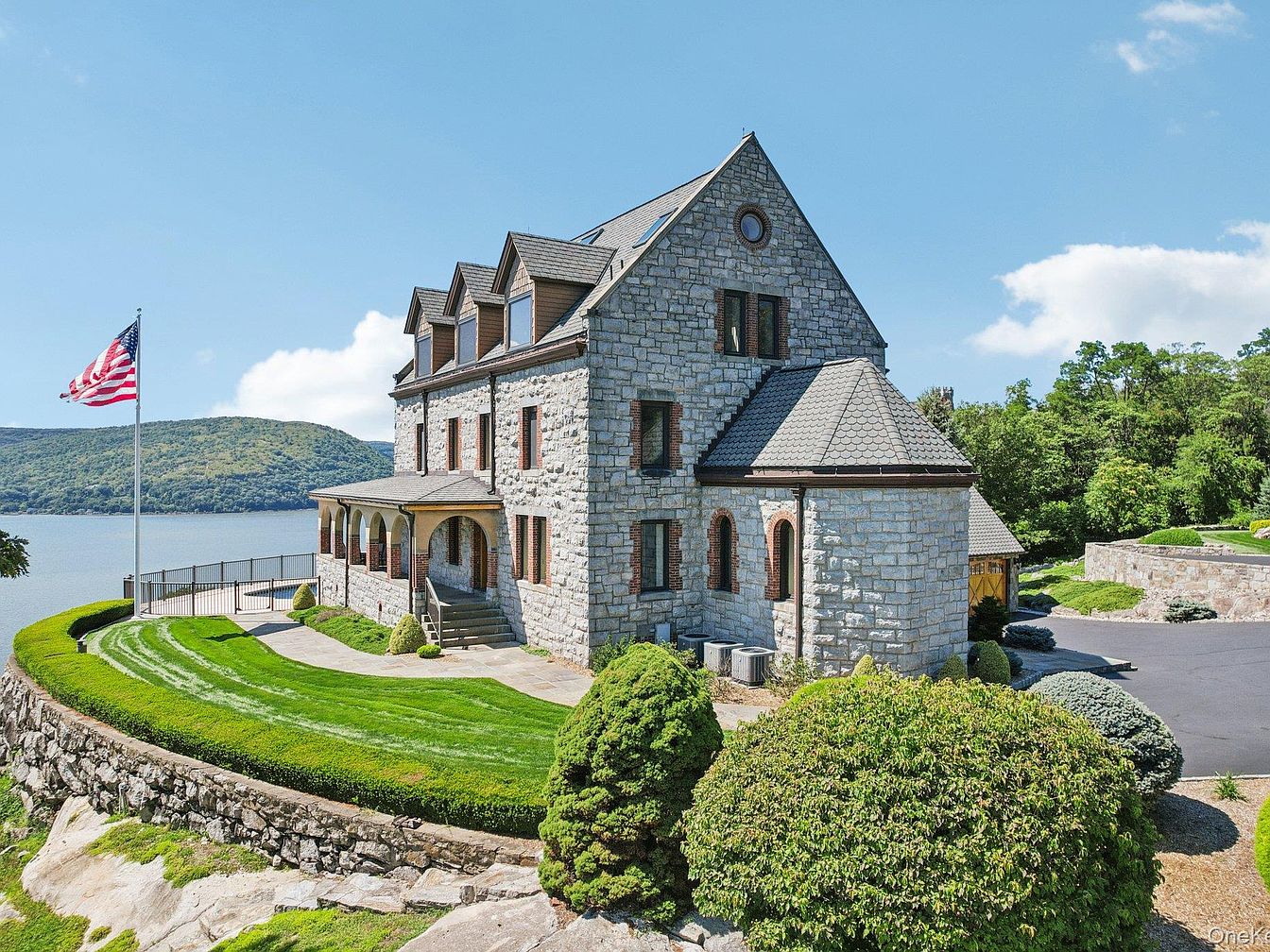 A stunning stone-clad lakefront home sits proudly at the edge of the water, offering breathtaking panoramic views. Its facade is defined by intricate masonry, classic arched windows, and a charming wraparound porch, ideal for relaxing with family or entertaining guests. The manicured lawn and sculpted hedges add a welcoming, family-friendly touch with plenty of outdoor space for children to play. A large American flag waves gently, enhancing the sense of tradition and community. The exterior’s soft gray stone is offset by natural wood accents and crisp landscaping, all nestled against a backdrop of rolling hills and sparkling blue water.