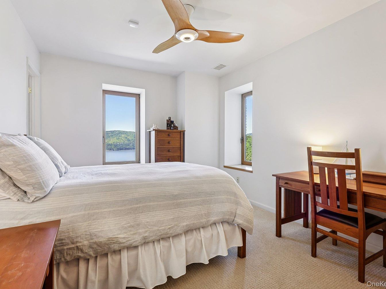 This serene bedroom features large windows and a glass door that overlook a stunning lake, flooding the space with natural light and connecting the outdoors to the coziness within. The room’s neutral palette, with soft beige carpeting and crisp white walls, creates a calming retreat suitable for any family member. A plush bed with layered linens promises comfort, while a sturdy wooden dresser and a large wooden desk provide ample storage and workspace, making the space functional for studying or working from home. The ceiling fan adds modern flair, and the simple décor keeps the atmosphere restful and inviting.