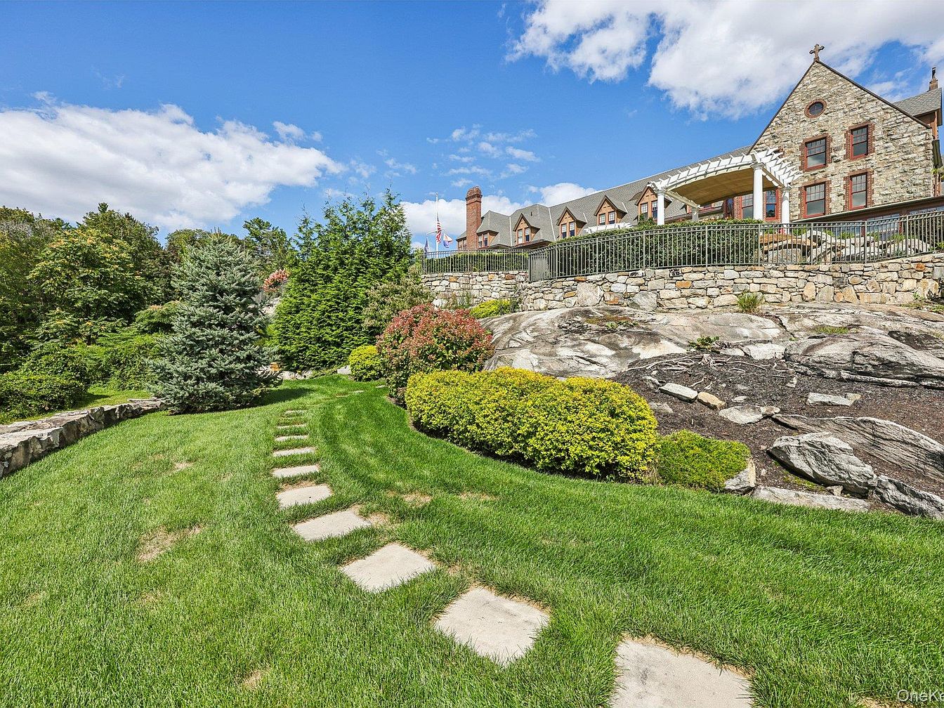 A charming garden pathway meanders through lush green grass, bordered by neatly trimmed hedges and mature trees, leading up to an impressive stone-clad home. The landscaping features tiered stone walls, giving depth and character to the outdoor space, while ornamental bushes and evergreen shrubs provide vibrant color and year-round interest. Natural stone pavers invite family and children to explore outdoors safely, making this an ideal spot for play or relaxation. The classic architecture of the house, combined with the thoughtfully designed outdoor area, offers a tranquil oasis perfect for gatherings, sunny afternoons, and enjoying the outdoors with loved ones.