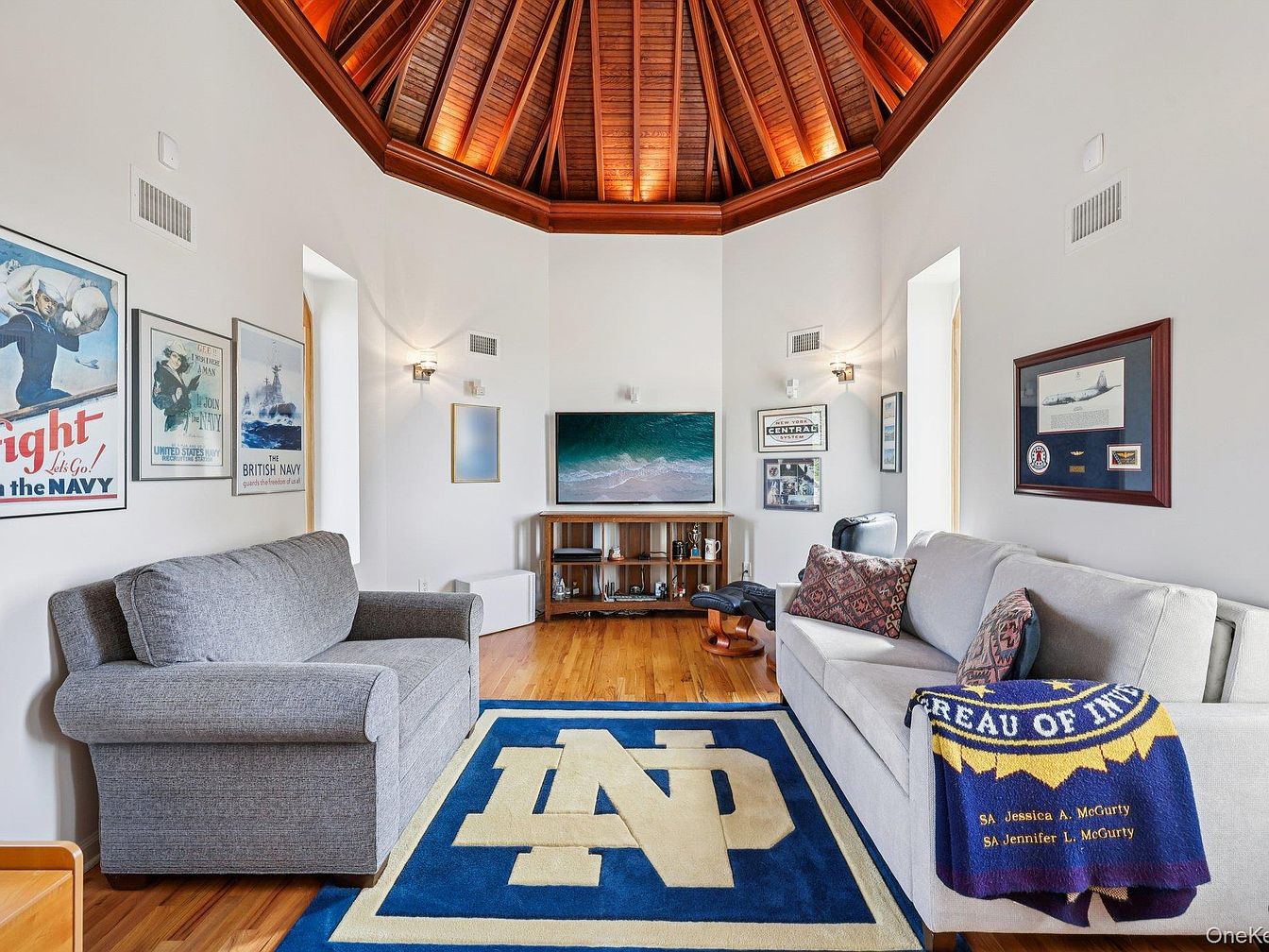 This inviting family room offers a comfortable and stylish space for relaxation or entertaining. The dramatic vaulted wood ceiling adds warmth and architectural interest, complementing the neutral walls and hardwood floors. Two plush, upholstered sofas provide cozy seating for gatherings or movie nights, while the vibrant area rug and collegiate throw introduce playful personality. Nautical and military-themed artwork line the walls, illustrating family heritage and interests. A sleek media console houses entertainment essentials beneath a mounted television, and large windows on either side fill the room with natural light, making it both family-friendly and inspiring for everyday enjoyment.