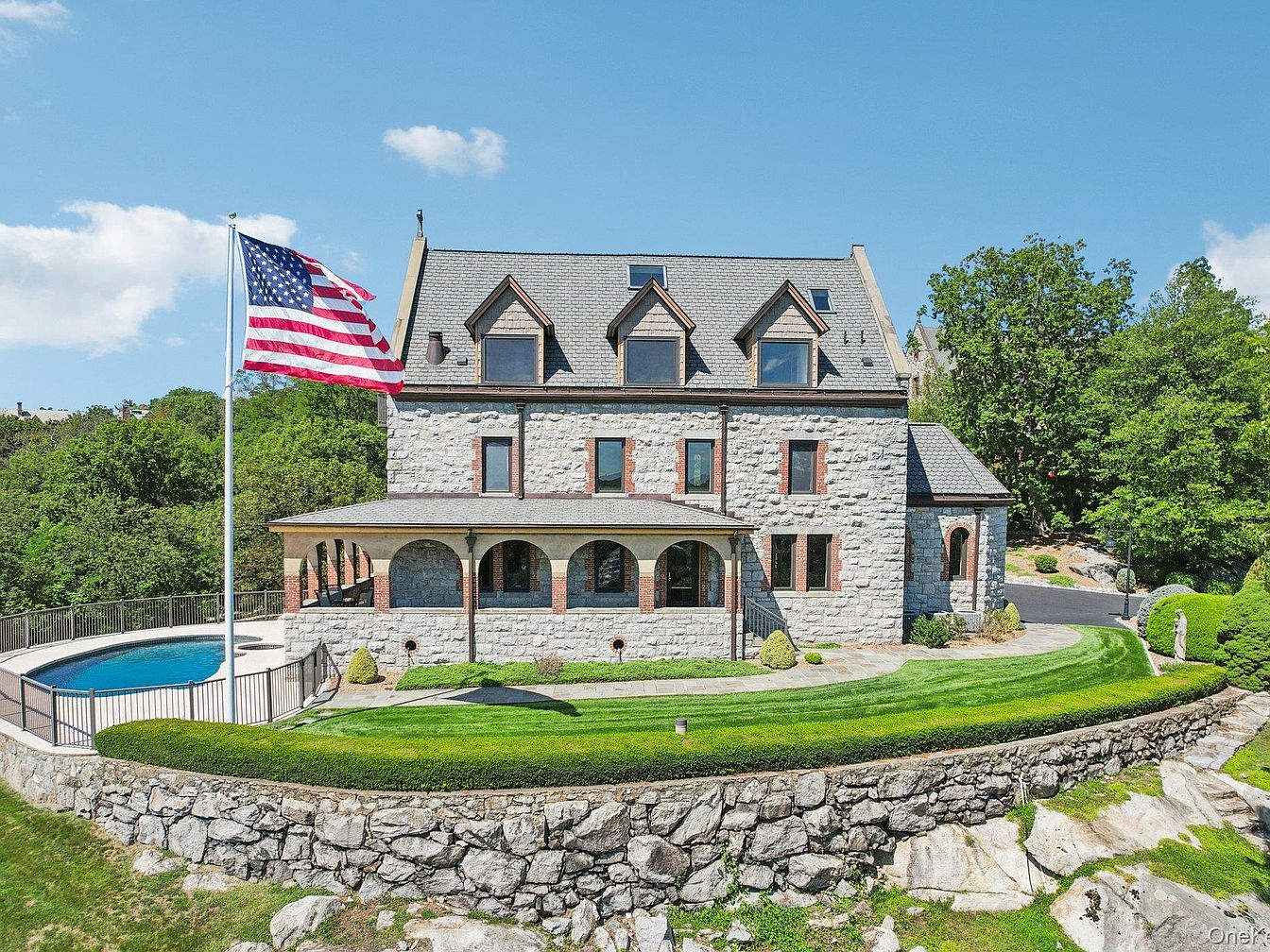 A stately stone-clad home stands proudly atop a gently sloping hill, bordered by manicured lawns and well-trimmed hedges. The residence features a graceful arched porch stretching across the front, ideal for social gatherings and family relaxation. Large, symmetrical windows highlight the historic-inspired architecture while allowing ample natural light. The property is securely enclosed by a charming stone retaining wall, ensuring safety for children to play outdoors. A circular driveway provides easy access, and a spacious, fenced-in swimming pool offers abundant summer recreation for all ages. The elegant landscaping and patriotic flagpole complete the captivating and welcoming curb appeal.