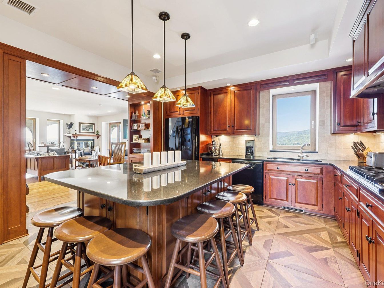 A spacious and inviting kitchen features rich wood cabinetry, a large central island with dark granite countertop, and six wooden stools, ideal for family gatherings or casual meals. Pendant lights hang above, contributing both warmth and elegance to the space. The open layout connects seamlessly to the living and dining areas, making the kitchen the heart of the home. Ample countertop space and modern appliances encourage cooking and spending time together. Natural light streams in from a window above the sink, highlighting the beautifully patterned floors and adding a welcoming ambiance, perfect for family-friendly living and entertaining guests.