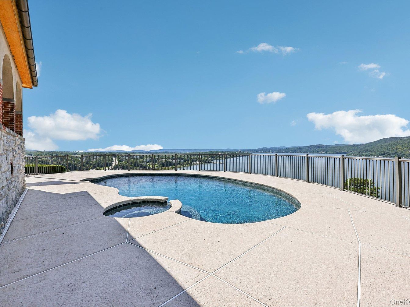 A sunlit backyard pool terrace offers a panoramic vista of rolling hills and a tranquil lake, framed by a sturdy iron safety fence for peace of mind and family-friendly enjoyment. The spacious patio boasts pale stonework that contrasts beautifully with the blue water, and the curved pool design is paired with an integrated spa section for maximum relaxation. The adjacent stone exterior and brick details of the home add a touch of rustic charm, blending harmoniously with the environment. This inviting outdoor oasis provides an ideal setting for both entertaining and relaxing, catering to both adults and children alike.