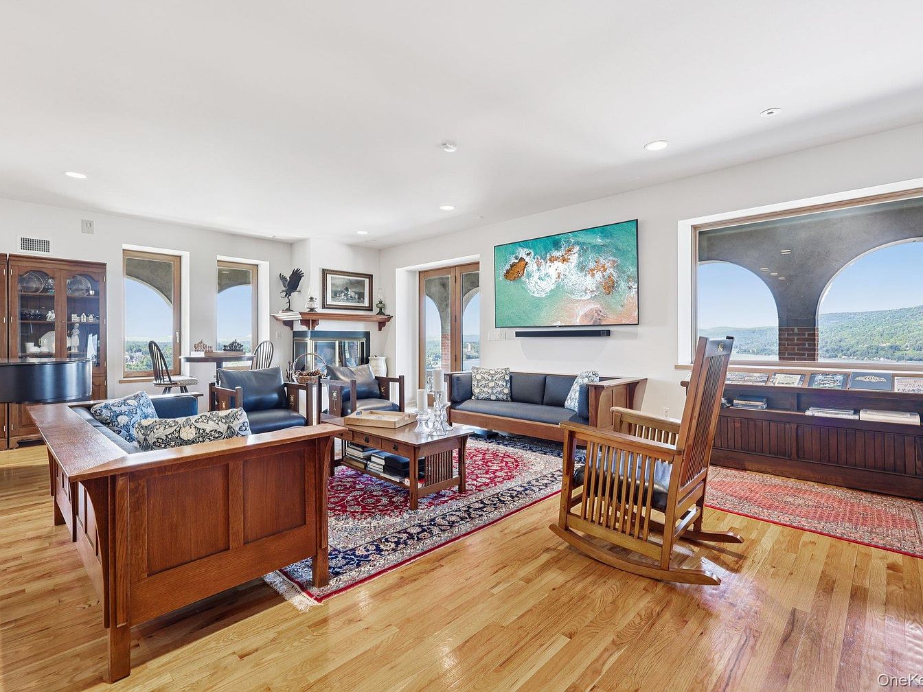 Spacious living room blending classic and modern elements with an open and airy layout. Natural light pours in through large arched windows, offering stunning views and creating an inviting atmosphere. Warm hardwood floors complement craftsman-style wooden furniture, including a sturdy coffee table, sofas with elegant navy and patterned cushions, and a traditional rocking chair. A grand area rug adds coziness, while tasteful décor, such as a display cabinet and artwork, enhances the space. The set-up encourages family gatherings, reading, and relaxation, with an attractive fireplace and TV as focal points. Thoughtful shelving and roomy seating ensure comfort for all ages.