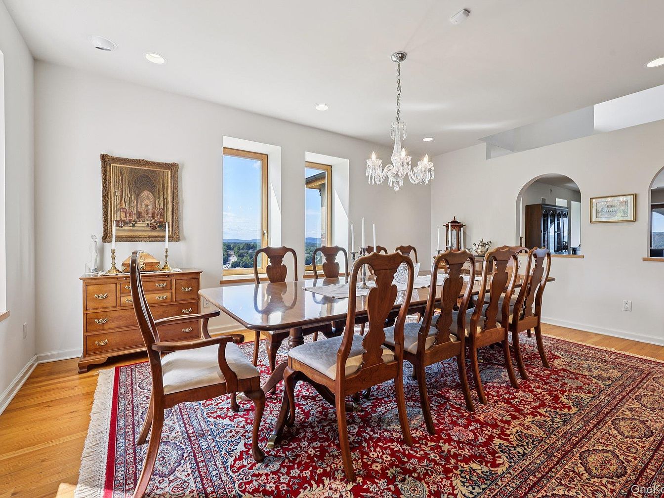 Bright and inviting, this formal dining room offers a sophisticated atmosphere for family gatherings and entertaining guests. Natural light streams through large windows that frame scenic views, complementing the neutral-toned walls and honey-hued hardwood floors. The centerpiece is an elegant wooden dining table surrounded by ten classic chairs with upholstered seats, sitting atop an ornate red Persian rug that adds warmth and color. A crystal chandelier hangs above, creating a touch of timeless charm. Traditional wood furniture and tasteful artwork enhance the room’s welcoming ambiance, while the open layout and arched doorways promote a seamless flow for social occasions and family meals.