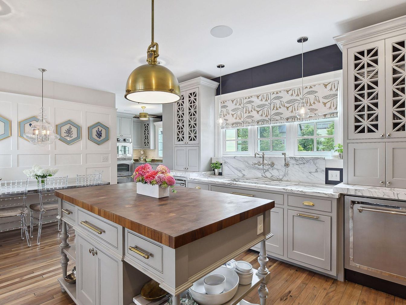 A bright, inviting kitchen features a large central island with a rich wooden countertop, perfect for meal prep, homework, or casual family gatherings. Light gray cabinetry, marble countertops, and a matching backsplash create an elegant yet timeless look, while gold hardware and pendants add a touch of warmth. The wide window brings plenty of natural sunlight, complemented by a botanical patterned window shade and decorative wall trim. Family-friendly touches include ample storage, easy-to-clean surfaces, and open sightlines to a dining nook with transparent chairs and floral arrangements, making it both beautiful and practical for daily life.