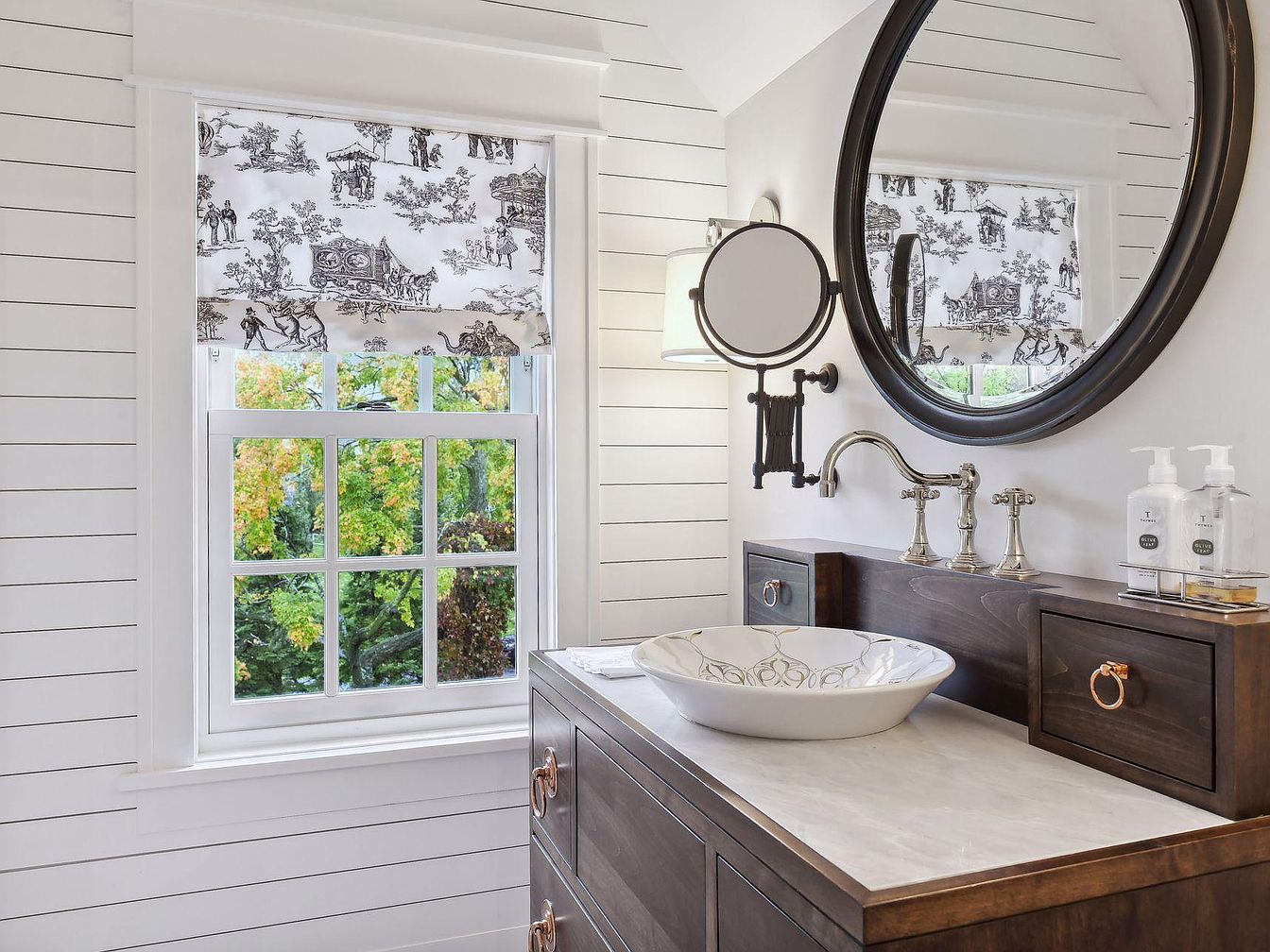 Bright and inviting, this bathroom vanity area features a round mirror framed in bold black over a rich wood cabinet with elegant brass hardware. The vessel sink is accented with delicate gold patterns, complementing the classic faucet fixtures. White shiplap walls open up the space and are paired with charming Roman window shades decorated in black and white pastoral motifs. Natural light pours in through the grid window, creating a fresh atmosphere suitable for family use. A handy magnifying mirror and practical soap dispensers add thoughtful, family-friendly touches to this beautifully styled corner.