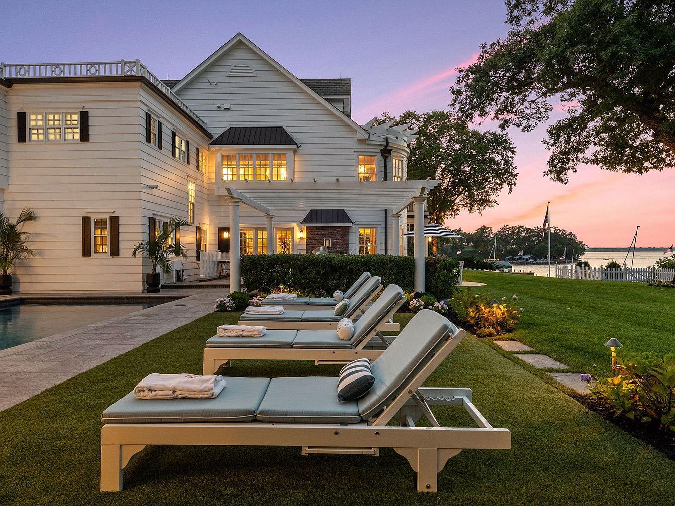 An inviting backyard oasis features a sparkling pool flanked by a row of cushioned lounge chairs, each topped with neatly folded towels, perfect for family relaxation or entertaining guests. The house’s crisp white siding with black accents and abundant windows glows warmly at sunset, creating a cozy, welcoming ambiance. A white pergola frames the outdoor living space, seamlessly connecting the landscaped lawn to the water’s edge, where sailboats bob on the horizon. Lush greenery and flower beds add vibrancy, making the area child-friendly and ideal for gatherings, cookouts, or peaceful afternoons spent enjoying the view and fresh air.