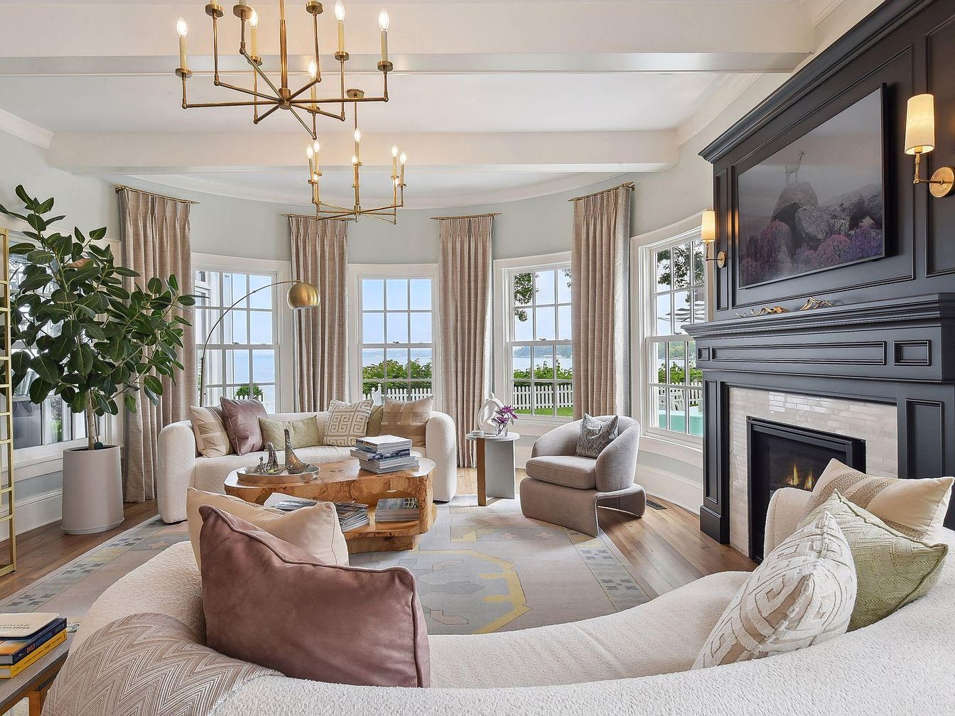 A bright, spacious living room with large bay windows invites natural light and showcases an idyllic garden and water view. Plush, curved sofas and a cozy armchair form an intimate seating area around a unique wooden coffee table, perfect for family gatherings or relaxation. The color palette combines gentle neutrals, soft creams, taupes, and sandy hues, with hints of blush on throw pillows, adding warmth and sophistication. Floor-to-ceiling drapes frame the windows, while sleek gold lighting fixtures and a grand charcoal fireplace add elegant architectural detail. Hardwood floors and contemporary art complete the inviting, family-friendly atmosphere.
