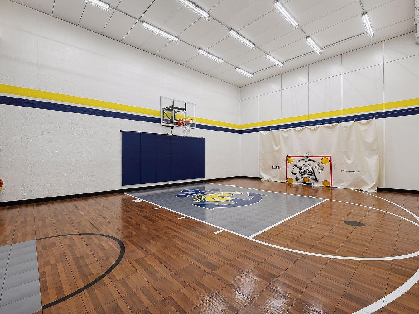 This spacious indoor sports court is designed with family fun and active living in mind. The polished wooden floor is accented with painted sports markings, including a basketball key and a vibrant mascot logo at the center, offering versatility for various games. Bright white walls, accented with navy blue and yellow stripes, create an energetic atmosphere. Overhead, modern, evenly spaced lighting ensures clear visibility. A basketball hoop and protective pads enhance safety, while a hockey practice target on the far wall adds variety, making the space perfect for all ages to play, practice, and gather year-round, regardless of the weather outside.