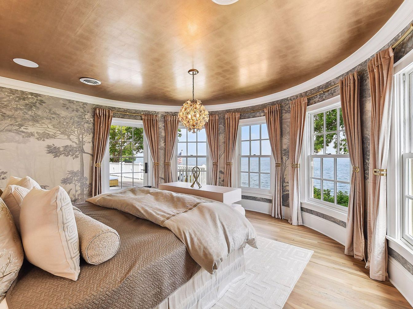 This serene master bedroom features a spectacular semicircular wall of windows offering panoramic water views, flooded with natural light, and framed by elegant taupe drapes. The luxurious ambiance is enhanced by a metallic gold ceiling and delicate wallpaper with nature-inspired motifs, creating a calming, sophisticated atmosphere. The plush king-sized bed is layered with neutral linens and decorative pillows, perfect for families seeking comfort and relaxation. A crystal chandelier adds a touch of glamour, while light hardwood floors and a pale rug contribute to the airy, spacious feel. The cozy sitting nook offers a quiet family-friendly spot for reading or unwinding.