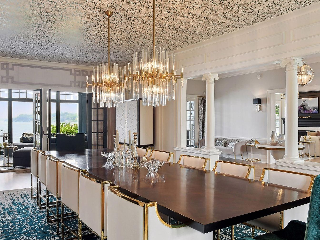 A sophisticated dining room featuring a long, polished wooden table surrounded by sleek upholstered chairs with gold accents, perfect for hosting large family gatherings. An intricate patterned ceiling paired with two dramatic, modern chandeliers gives the space a luxurious yet inviting ambiance. Floor-to-ceiling windows flood the room with natural light, offering stunning views of the outdoors and seamless indoor-outdoor flow. The open-plan layout, supported by stately white columns, connects the dining area with both the living room and a cozy sitting nook, making it ideal for family meals, entertaining, and relaxed conversations. Muted wall colors and blue-patterned rugs enhance the elegant atmosphere.