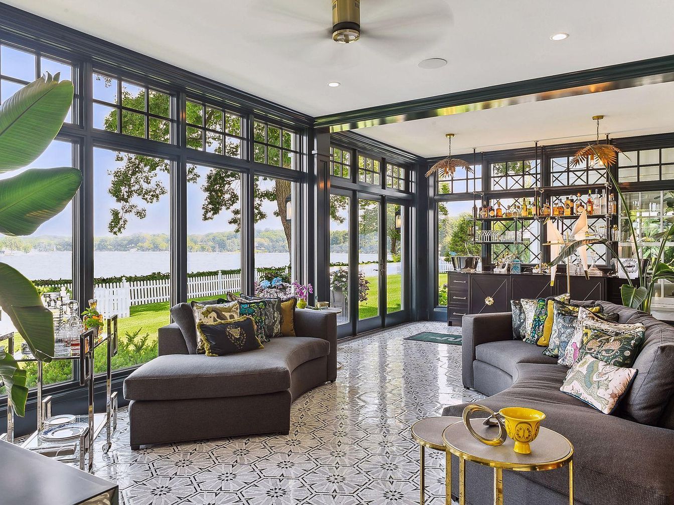 Floor-to-ceiling windows invite natural light, offering panoramic views of a lake and manicured yard, creating a tranquil and airy retreat. The sunroom layout is open and inviting, with two plush, dark gray sectional sofas adorned with vibrant, patterned pillows, offering both style and comfort for families. Children can freely play on the glossy, patterned tile flooring, which is both durable and elegant. Lush indoor plants, geometric gold-accented tables, and a stylish home bar area add a contemporary touch, while deep green trim on the windows and ceiling balances the inviting atmosphere with refined sophistication, ideal for relaxation or entertaining guests.