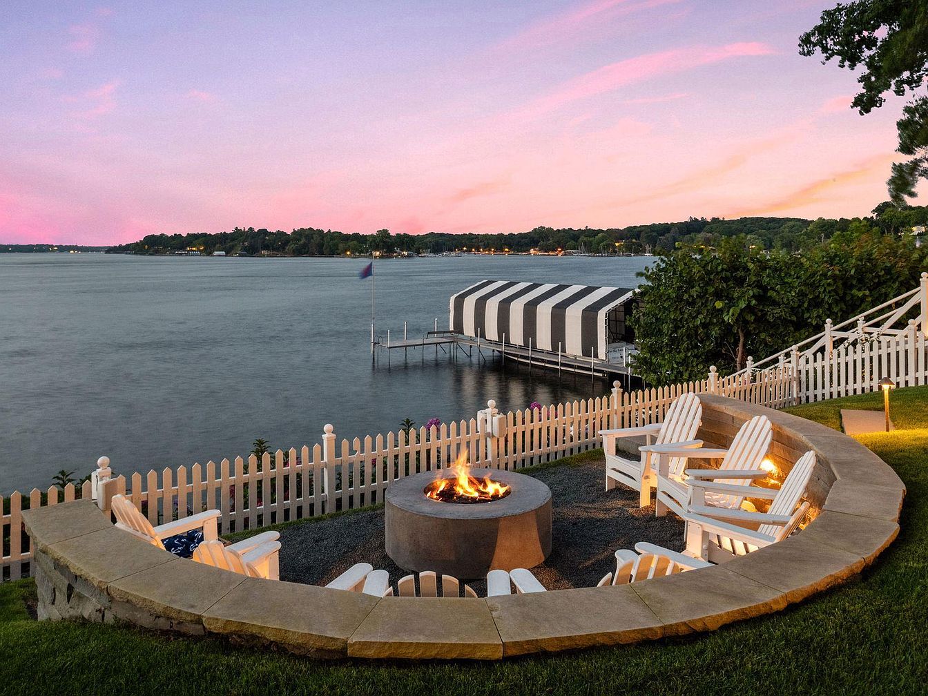 This inviting lakeside fire pit area is designed for relaxation and family gatherings, offering panoramic waterfront views at sunset. Classic white Adirondack chairs are arranged in a semi-circle around a central stone fire pit, set within a sunken gravel alcove bordered by a stone seating wall. The white picket fence and lush landscaping frame the space beautifully, adding a charming, cottage-like feel. The color scheme is soft and harmonious, with the muted tones of the furniture echoing the gentle sunset palette above the lake. Ideal for families, this space encourages togetherness and outdoor enjoyment in a serene setting.