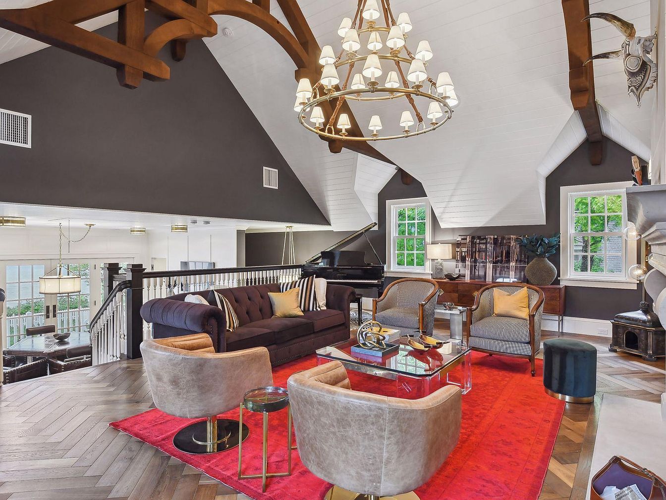 Spacious and inviting, this living room blends modern luxury with classic charm. Vaulted white ceilings with exposed wooden beams draw the eye upward, while a grand chandelier adds elegance and warmth. A rich, tufted sofa anchors the space, complemented by plush armchairs set atop a vibrant red area rug. Natural light pours through large windows, creating an airy feel. The open layout allows for easy movement, perfect for gatherings or family time. The cozy color palette of deep neutrals, gold accents, and dashes of black and red makes the room both sophisticated and family-friendly. A grand piano hints at musical evenings and timeless traditions.