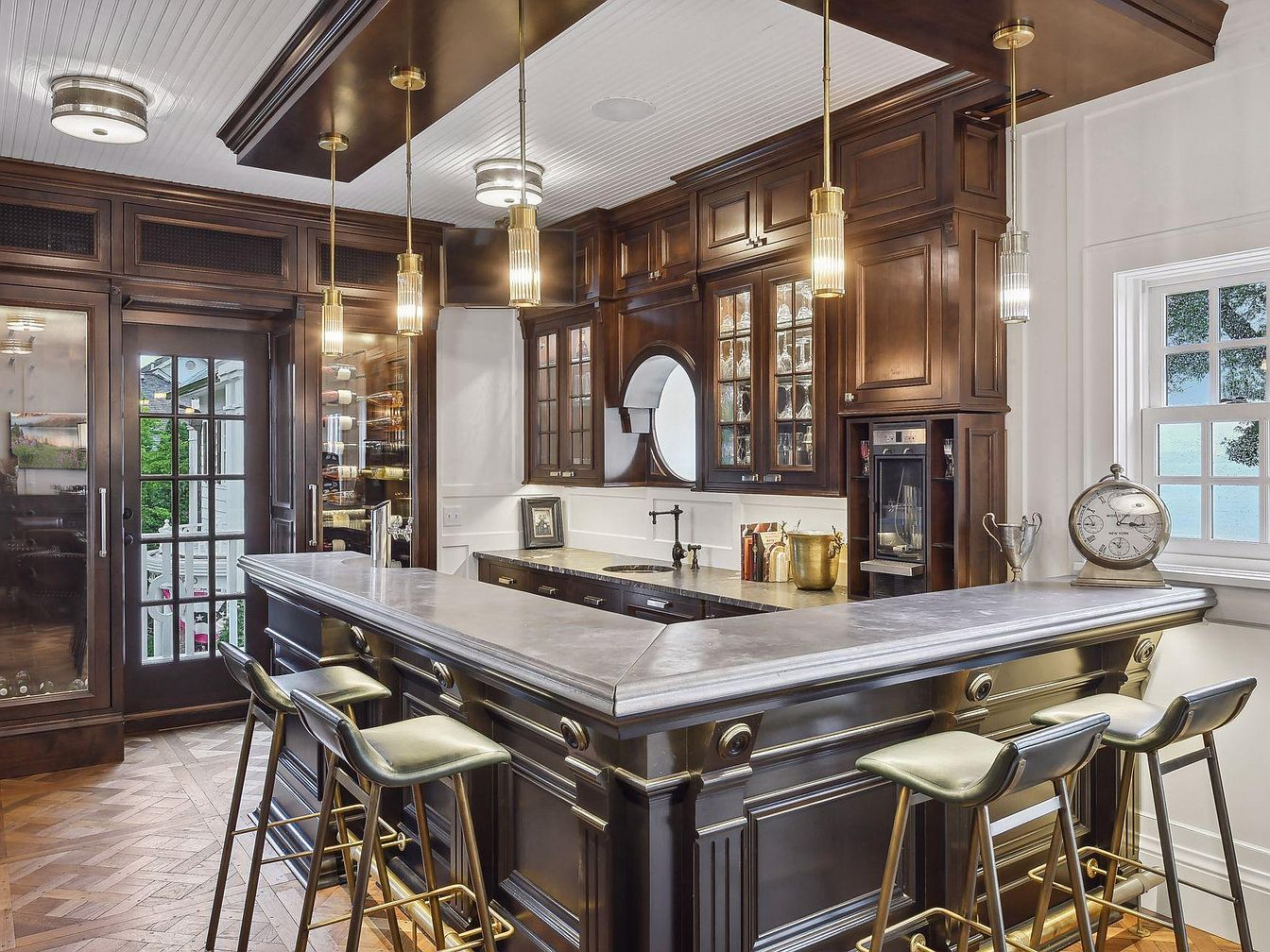 A warm and inviting kitchen features rich dark wood cabinetry accented by elegant brass hardware and glass-paneled cabinets. The impressive L-shaped island includes a polished marble countertop with ample space for family gatherings, complete with four cushioned barstools for casual seating. Pendant lights hang gracefully overhead, casting a welcoming glow and highlighting the sophisticated architectural moldings on the cabinetry and ceiling. Sleek stainless steel appliances blend seamlessly, while decorative accents like a vintage clock and trophy add character. Large windows and French doors fill the space with natural light, making it an ideal setting for both family meals and entertaining guests.