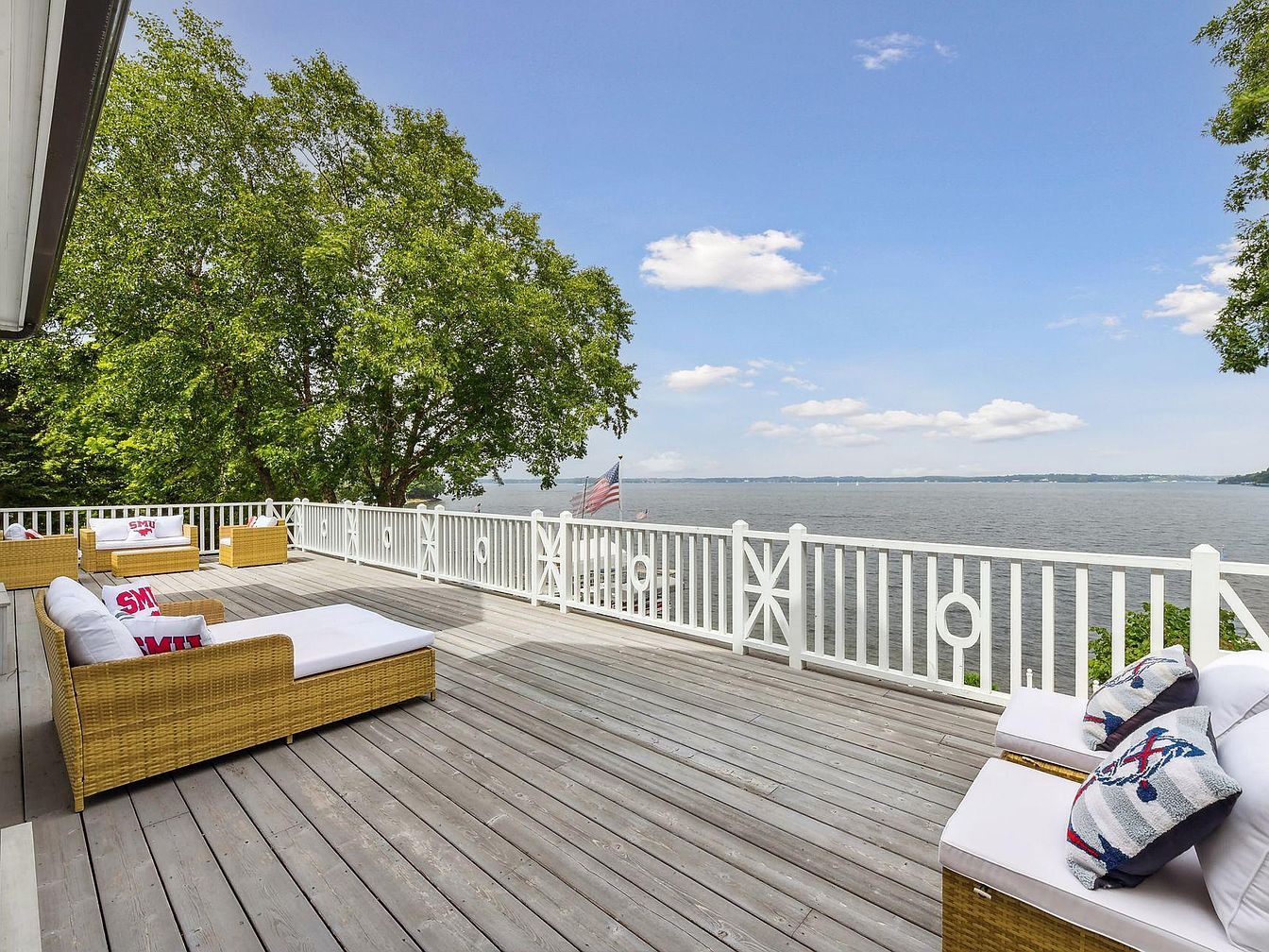 This expansive lakefront patio combines relaxed elegance with family-friendly functionality. Built with wide, weathered wooden planks, the space is bordered by a charming white railing that ensures safety for children while preserving panoramic water views. Comfortable wicker lounge furniture, topped with plush white cushions and playful accent pillows, invites everyone to unwind or gather for outdoor activities. The open layout allows ample room for entertaining or casual lounging, while mature shade trees add privacy and a touch of greenery. The serene color palette seamlessly harmonizes with the sky and lake, creating a peaceful retreat perfect for all ages.