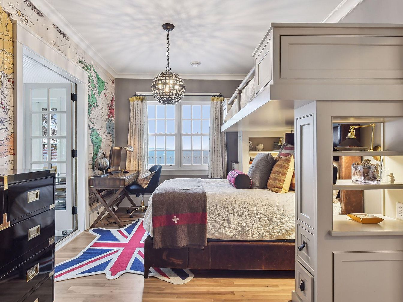 A bright, cheerful kid’s bedroom combines functionality and playful style, featuring a cozy bed with a built-in loft above for additional storage or sleep space. The room’s focal wall is adorned with a colorful vintage world map wallpaper, igniting a sense of adventure. A sturdy wood desk sits beneath the large window, ideal for homework or creative projects, and is complemented by classic study accessories. Light wood floors and a vibrant Union Jack rug infuse energy, while shelving provides easy access to favorite books and toys. The soft, neutral color palette, ample natural light, and comfortable furnishings make this space welcoming and family friendly.