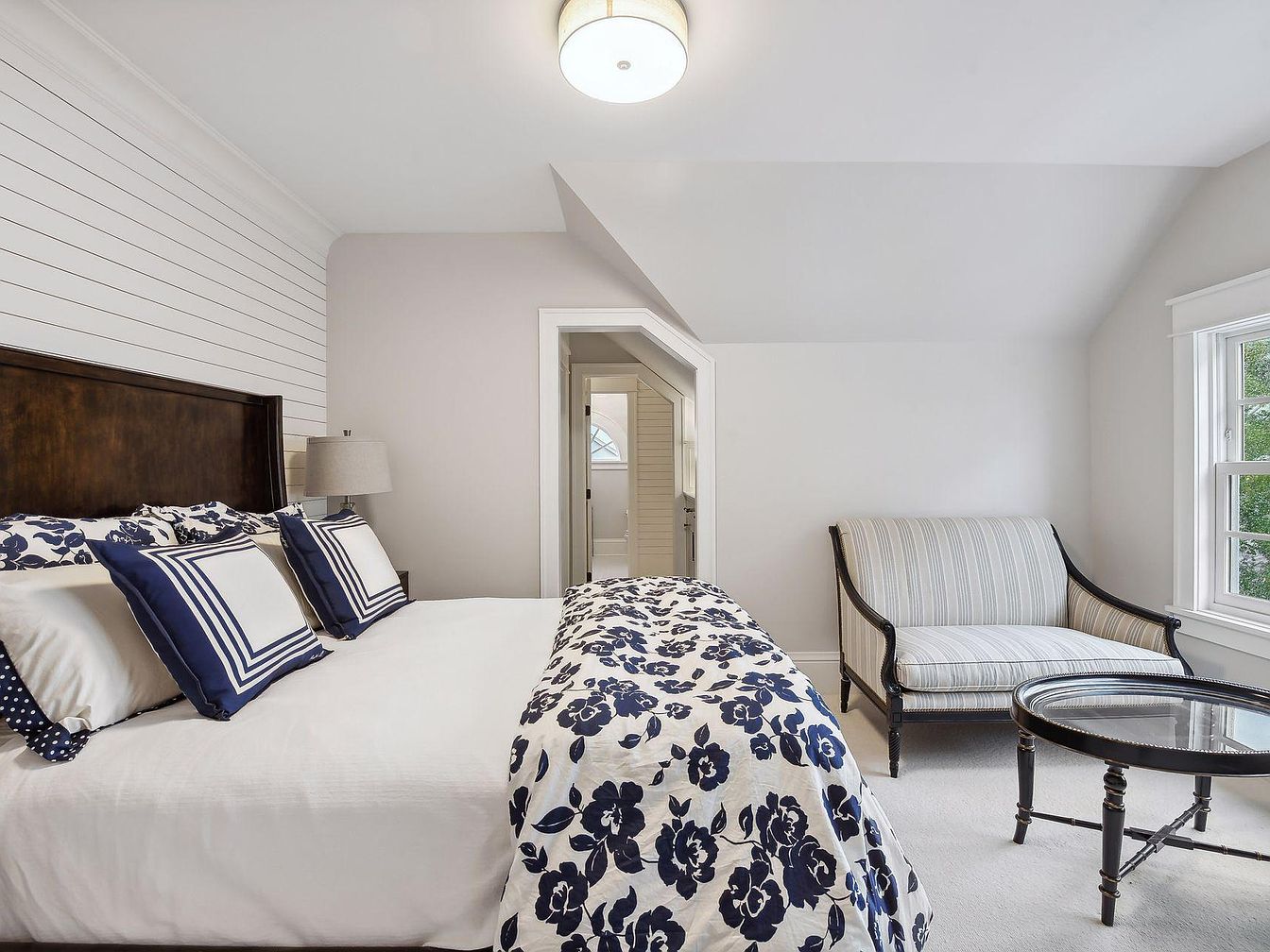 A bright and inviting bedroom corner features a queen-sized bed with a rich wooden headboard and bedding adorned in navy and white floral patterns, creating a fresh yet classic look. The shiplap accent wall and soft grey paint add texture and depth, while large windows flood the space with natural light, making it ideal for a family setting. A striped upholstered settee and round glass coffee table provide a comfortable reading nook or spot for morning coffee. Ample floor space and uncluttered surfaces allow for easy movement, making this a practical and welcoming retreat for all ages.