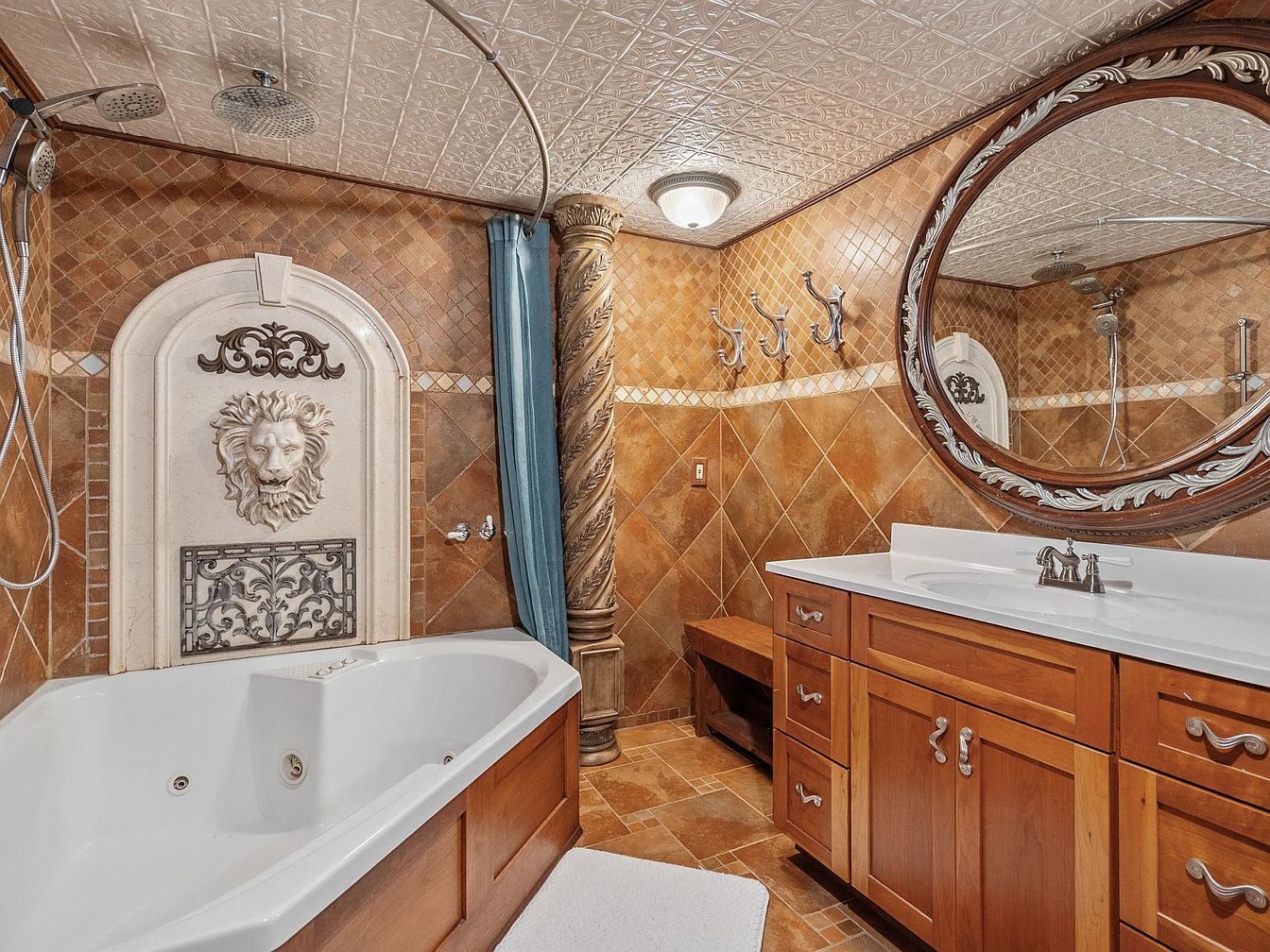 Warm earth-toned tiles create an inviting backdrop in this luxurious bathroom, complete with a spacious soaking tub that features elegant wood paneling. A striking carved lion’s head decorates the wall above the tub, adding a classical focal point and touch of grandeur. A column with ornate detailing separates the tub area from the extensive double sink vanity, which offers ample storage and convenience for family use. The large oval mirror framed in wood with intricate leaf motifs echoes the room’s classical elegance. Practical hooks and a built-in bench provide functional family-friendly elements, making the space both beautiful and accommodating.