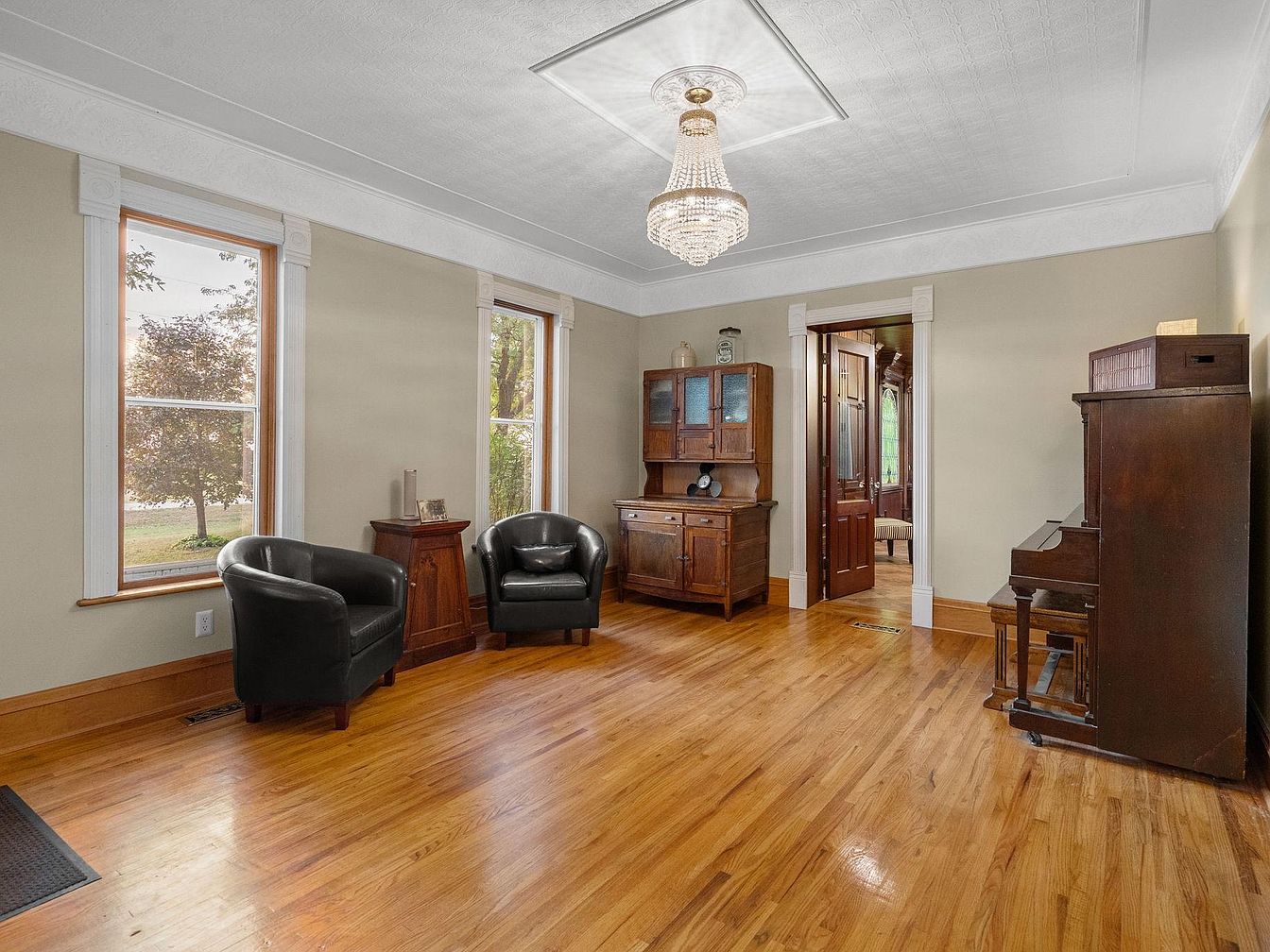 Warm hardwood floors and expansive windows define this inviting sitting area, filling the space with natural light and views of the outdoors. Two cushy leather armchairs offer a cozy spot for reading or conversation, accented by rich wood trim and classic baseboards. A vintage piano and a glass-front hutch add timeless character, while a sparkling chandelier draws the eye upward toward the textured ceiling for a touch of glamour. Neutral, beige-toned walls provide a calming backdrop, making this a flexible family space ideal for entertaining guests, practicing music, or sharing quiet moments together.