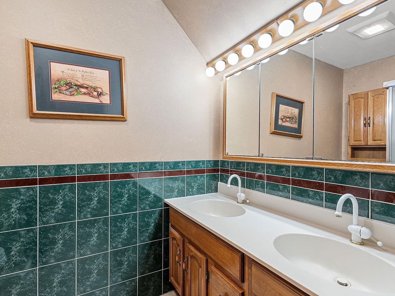 A spacious bathroom features a double vanity with a solid white countertop, perfect for accommodating the needs of a busy family. The cabinetry is crafted from warm-toned wood, adding a cozy and inviting atmosphere. Deep green marble-look tiles line the lower half of the walls, accented by a bold burgundy stripe, while the upper half is painted in a soft beige. Above the vanity, a large mirror with built-in Hollywood-style lighting ensures ample brightness for morning routines. Additional wall art and storage cabinets provide both decorative flair and practical functionality, making this space both stylish and family-friendly.