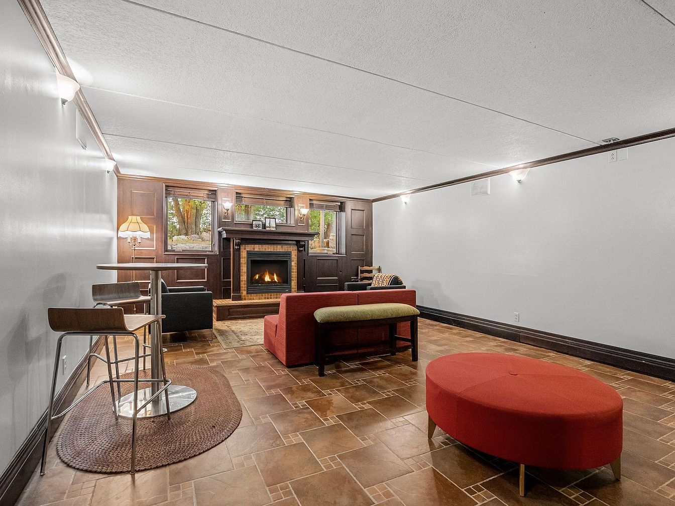This spacious family room features a cozy fireplace framed by warm wooden paneling and large windows, creating an inviting focal point for gatherings. The room’s open layout includes comfortable, family-friendly seating arrangements such as a bold red oval ottoman, a soft green-backed sofa, and modern accent chairs. Overhead lighting softly illuminates the neutral-toned walls and complements the earthy, patterned tile flooring. A small bistro table with sleek wooden stools adds flexibility for snacks or games. The minimal yet functional decor, light-colored ceiling, and ample space ensure this room is both relaxing and perfect for entertaining family or friends.