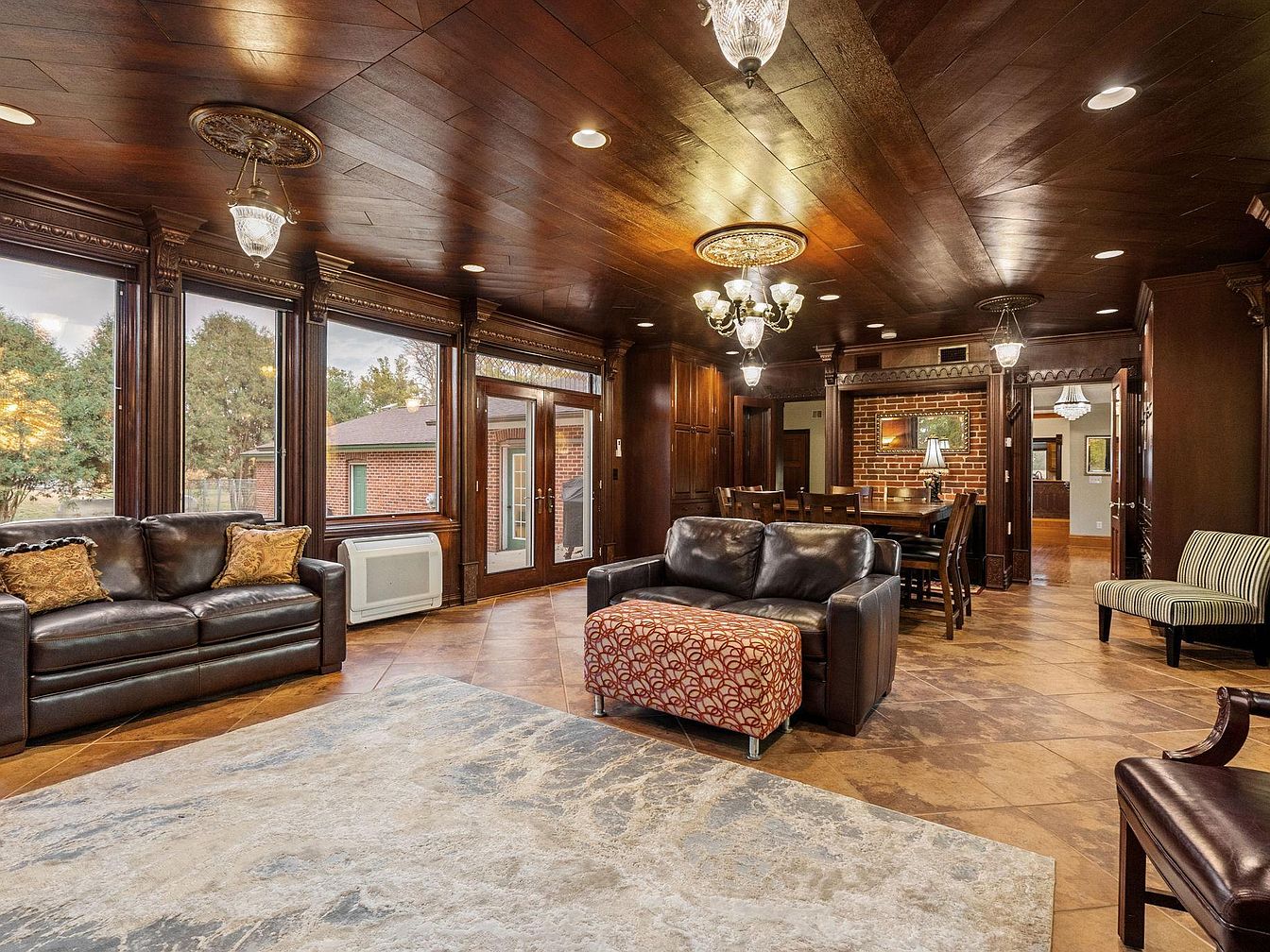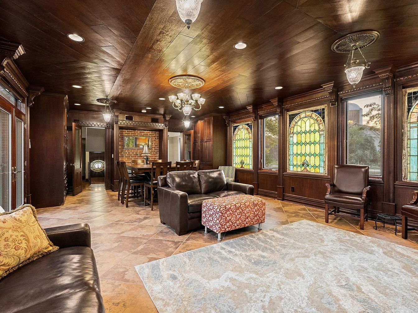 A spacious living room blends traditional elegance with family-friendly comfort. The open layout features richly stained wood paneling and intricate crown molding, creating a warm and inviting atmosphere. Expansive stained glass windows bathe the room in soft, colorful light while providing charming views outdoors. Comfortable leather sofas and armchairs invite relaxation and conversation, and a patterned ottoman adds a touch of playfulness perfect for family gatherings. The muted tile flooring and neutral area rug enhance the room’s cozy appeal. A formal dining area is seamlessly integrated adjacent to the sitting space, making this room ideal for entertaining or everyday family use.