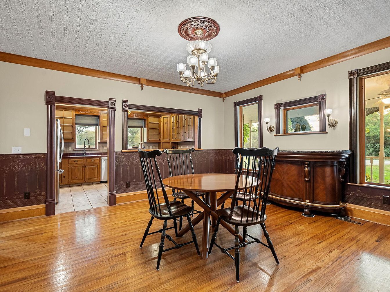 A spacious dining room highlighted by elegant traditional details, featuring hardwood floors that offer warmth and easy maintenance for families. A round wooden dining table with spindle-back chairs sits at the center, providing a welcoming spot for meals, games, and conversation. The room showcases ornate crown molding, decorative wainscoting, and classic wood trim that frames doorways and windows, blending vintage character with modern comfort. Ample natural light pours in through multiple windows, creating a bright, airy atmosphere. A rich wood buffet adds practicality and charm, while the chandelier above adds a subtle touch of luxury to gatherings or daily dining.