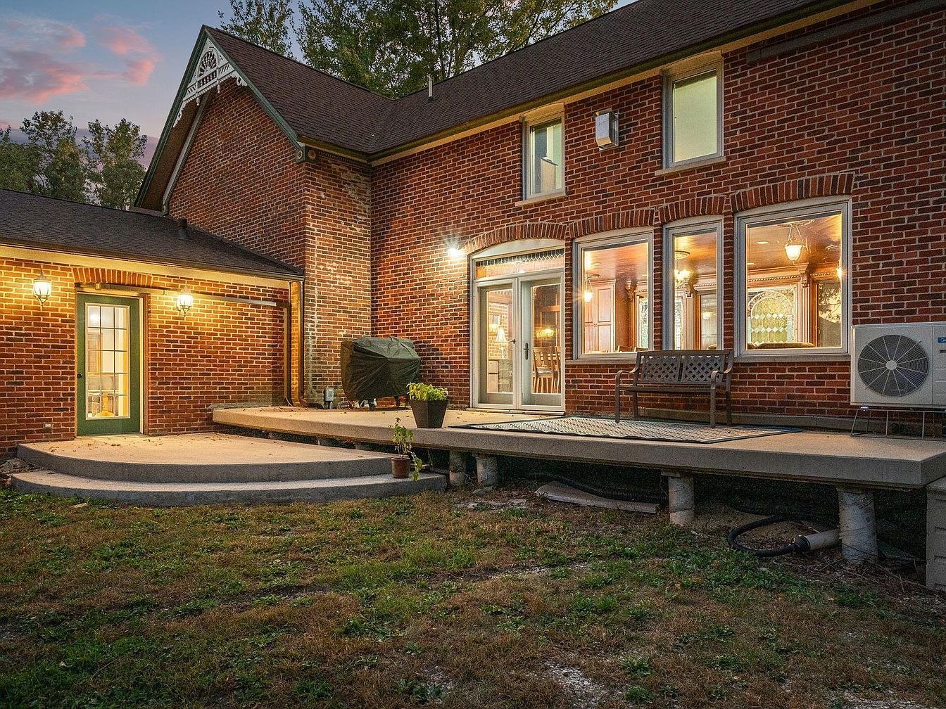 An inviting brick patio serves as the focal point for the home’s backyard, blending traditional charm with modern outdoor living. Wide concrete steps lead to a spacious platform, perfect for gatherings or quiet family evenings. A decorative metal bench encourages relaxation, while potted plants add a hint of greenery. The home’s brick façade is beautifully illuminated by classic wall lanterns, enhancing the warm red and earthy tones. Large windows and glass doors offer clear views into a glowing, wood-trimmed interior, making this transitional space ideal for both entertaining and watching kids play from the comfort of indoors.