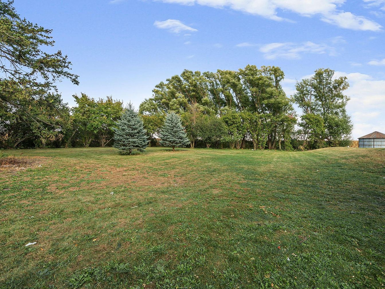 Expansive and inviting, the backyard lawn provides an open green space perfect for outdoor family activities, picnics, or children’s play. Mature trees border the perimeter, creating natural shade and privacy, while a couple of blue spruce trees add touch of year-round greenery. The gently rolling landscape offers plenty of room for garden beds, sports, or a future playset. The well-maintained grass is soft underfoot and ideal for both relaxation and recreation. Neutral earth tones from the grass and trees harmonize beautifully with the clear blue sky, making this backyard a versatile and welcoming extension of the home.