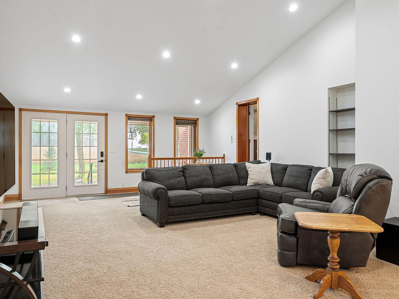 A spacious family room features plush beige carpeting and a neutral palette that creates a bright, welcoming atmosphere. Natural light pours in through twin windows and a pair of French doors, which offer seamless views and access to the backyard, perfect for indoor-outdoor living. The large charcoal sectional provides ample, comfortable seating for family gatherings, while an inviting recliner and a wooden side table create a cozy reading or relaxation nook. Simple wood trim frames the windows and built-ins, adding warmth and subtle contrast to the crisp white walls. Thoughtful design maximizes space for kids and adults alike to relax or play.