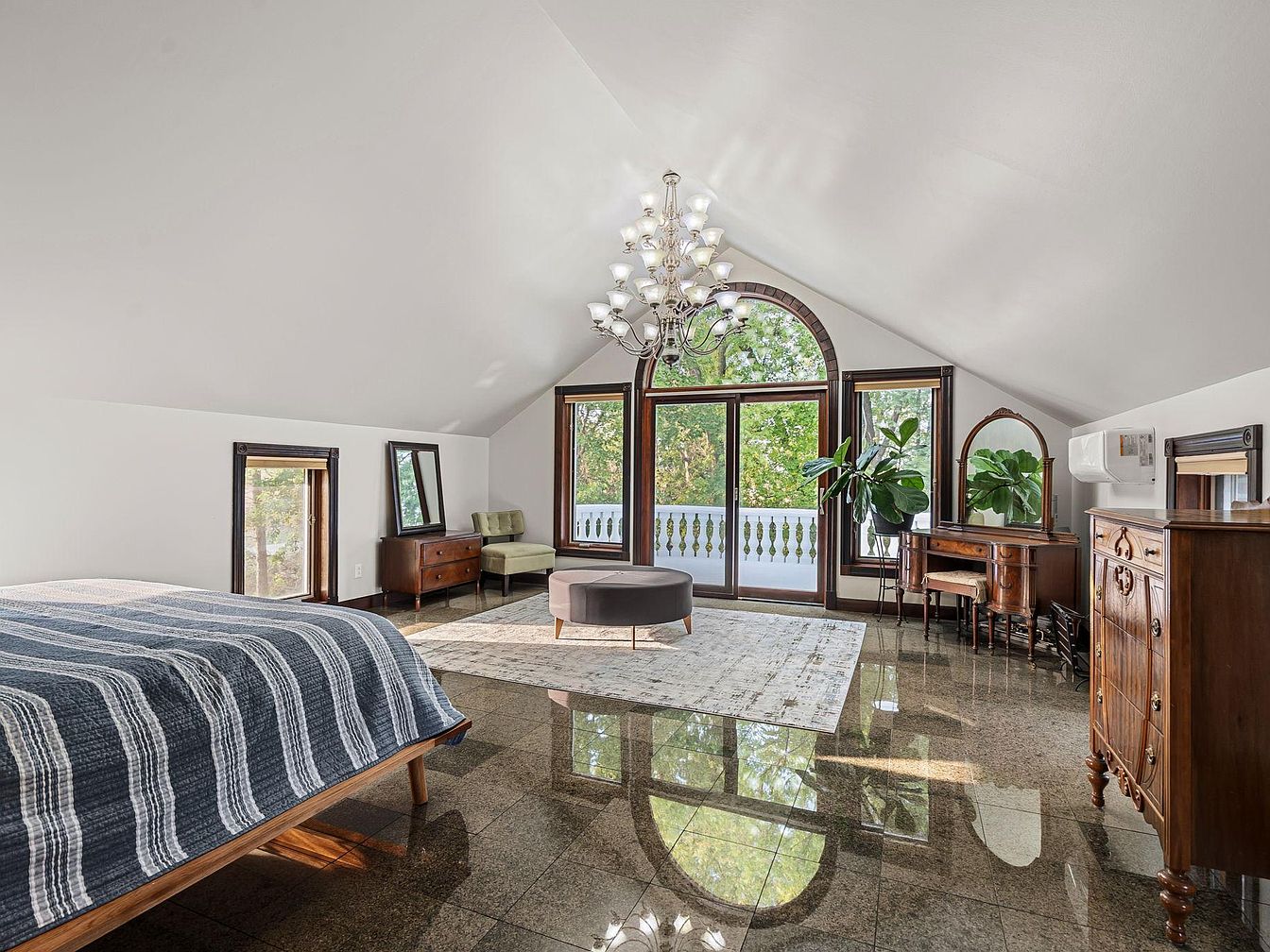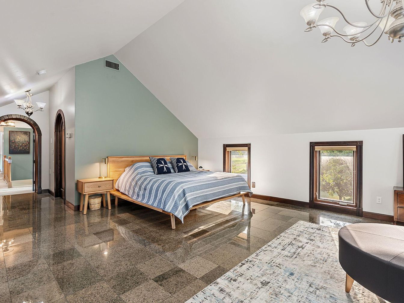 A spacious master bedroom features a contemporary design with polished stone floors that add a luxurious, modern touch. The sloped ceiling and trio of low, wide windows invite natural light while providing privacy and delightful views of the garden. Soft green and crisp white walls create a serene backdrop, with a natural wood bed and nightstands lending warmth and simplicity. The space is family-friendly, offering generous floor area perfect for kids to play or relax. The elegant chandelier and arched hallway entry add a touch of architectural character, blending style with comfortable functionality for everyday living.