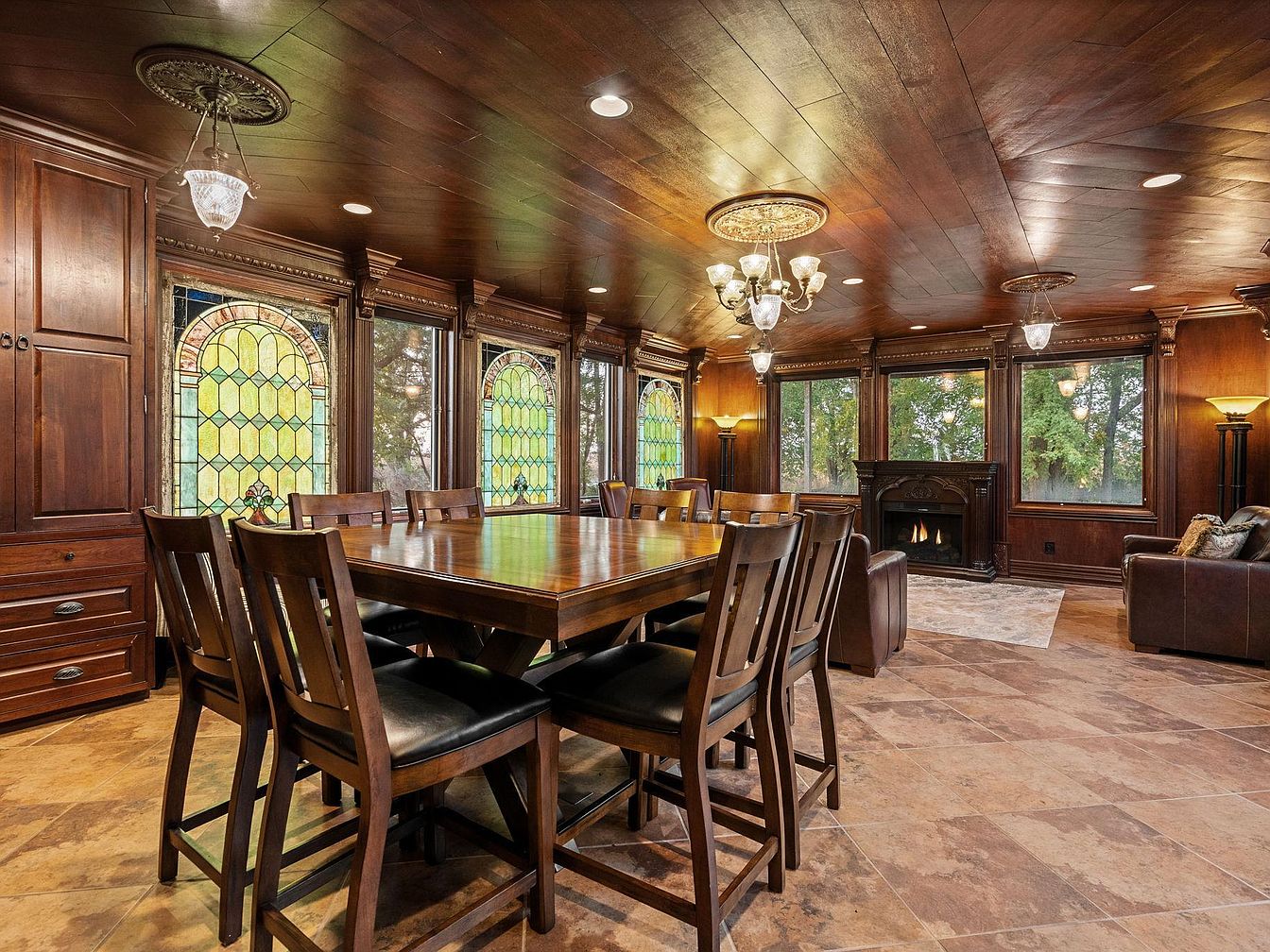 Rich wood paneling on ceilings and walls beautifully complements the earthy, tiled floor in this spacious dining area and family gathering space. A large wooden dining table with ample seating offers a welcoming spot for shared meals or activities. The space is bathed in warm light from classic chandeliers and vintage-style sconces, while panoramic windows, featuring elegant stained glass designs—provide a charming, timeless touch. A cozy fireplace anchors the adjoining lounge area, making this room perfect for family gatherings, celebrations, or quiet evenings. The harmonious use of dark wood and soft lighting enhances both elegance and comfort.