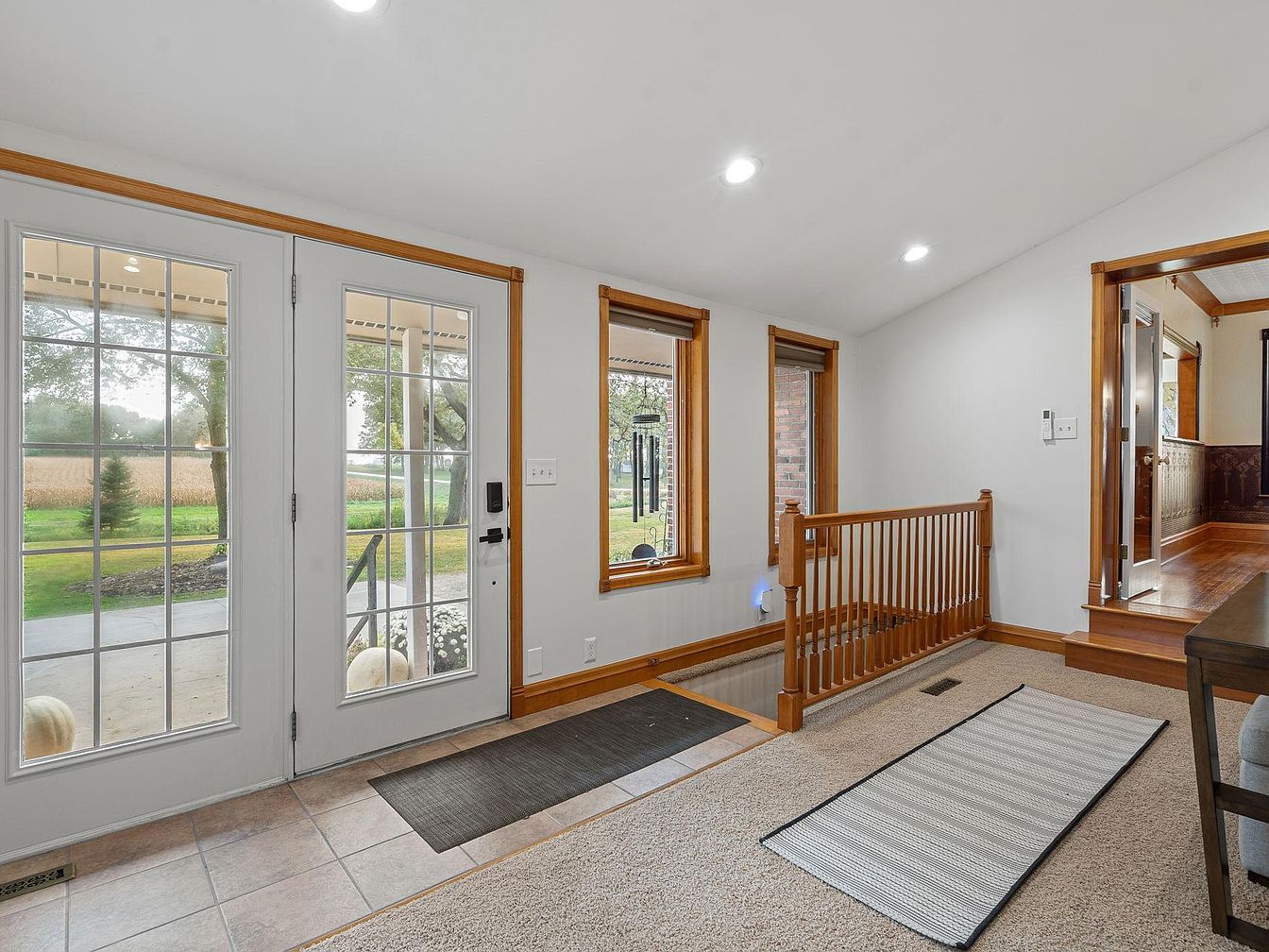 Bright and welcoming, the front entryway blends practicality with charm through its spacious layout and abundant natural light. Large glass-paned double doors and adjacent windows offer expansive views of the yard and fields, infusing the space with sunshine. The neutral tile floor transitions to plush carpet, accommodating both utility and comfort for families. Light wood trim around windows, doors, and stair railings adds warmth, while recessed lighting sets a soft, inviting tone. Direct access to the upstairs living area ensures convenience, while the sturdy stair railing increases safety for children or guests. Crisp white walls enhance the airy, open atmosphere.