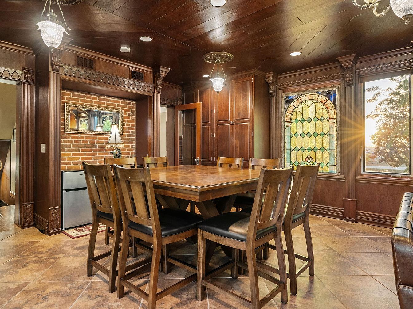Warm, rich woodwork envelops this inviting dining room, creating an atmosphere perfect for family gatherings or entertaining guests. The centerpiece is a large square dining table surrounded by comfortable wooden chairs with cushioned seats, allowing plenty of room for lively meals. A stained glass window bathes the space in a soft, colorful glow, and the room’s high ceilings feature elaborate crown molding and decorative trim for a touch of elegance. An exposed brick accent wall, rustic tile floor, and subtly integrated cabinetry add to the room’s charm and practicality, offering a blend of durability and timeless American craftsmanship.