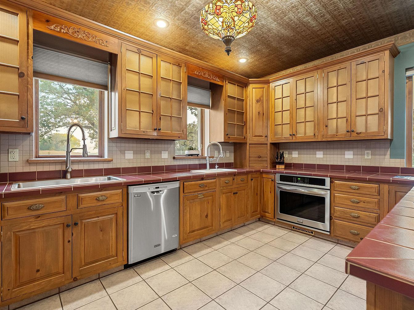 Warm wooden cabinetry with intricate trim sets a welcoming tone in this spacious kitchen. Ample counter space and a generous L-shaped layout make meal preparation easy for families, while a large window over the sink fills the room with natural light and offers scenic outdoor views. The cabinetry features glass-panel doors for display storage, while stainless steel appliances ensure modern convenience. Maroon tile countertops complement the earthy tones of the wood, and a patterned brass ceiling paired with a vibrant stained-glass pendant light adds vintage charm. Neutral tiled flooring completes the look, making this kitchen both practical and inviting for everyday family use.