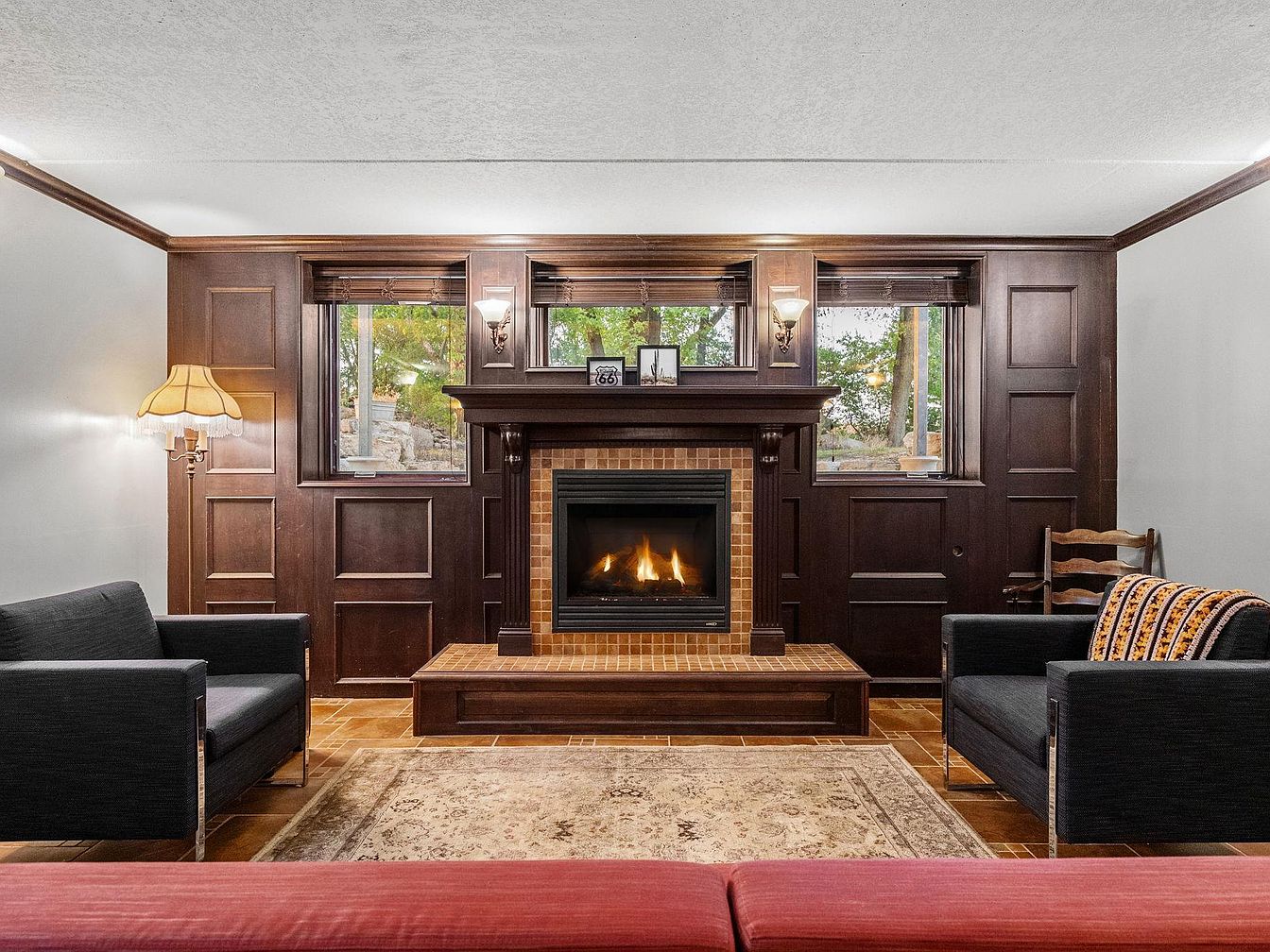 Warmth and elegance combine in this inviting living room, anchored by a stunning brick fireplace framed in rich, dark wood paneling. The symmetrical layout features two sleek, modern armchairs flanking a cozy area rug, providing an uncluttered space for family gatherings or quiet evenings by the fire. Large windows bring in ample natural light, while neutral walls balance the deep wood tones for a sophisticated yet welcoming feel. Subtle accent lighting and a vintage-style floor lamp add layers of brightness. The overall design is both timeless and family-friendly, offering a serene atmosphere ideal for relaxation and connection.