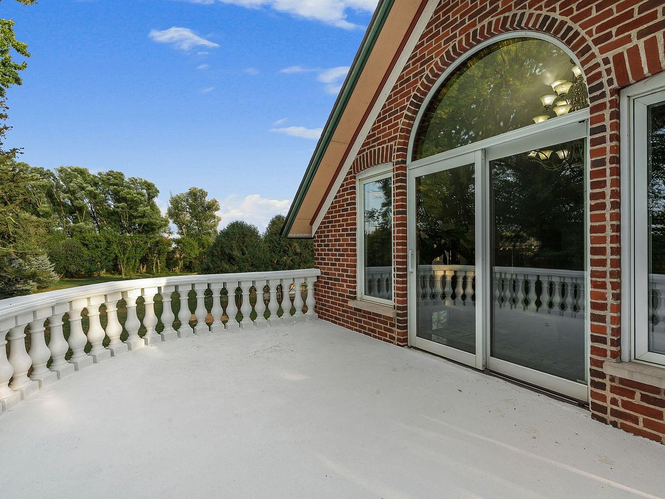 This inviting balcony features a sprawling white balustrade that adds a classic and elegant charm, perfect for family gatherings or a quiet retreat. The expansive outdoor space provides ample room for children to play safely or for entertaining guests during pleasant evenings. Large glass sliding doors framed by distinctive red brickwork connect the balcony seamlessly to the home’s interior, while an arched window above allows plenty of natural light to pour in. The crisp white flooring amplifies the airy and open atmosphere, and scenic views of lush green trees create a tranquil, picturesque setting ideal for relaxation.