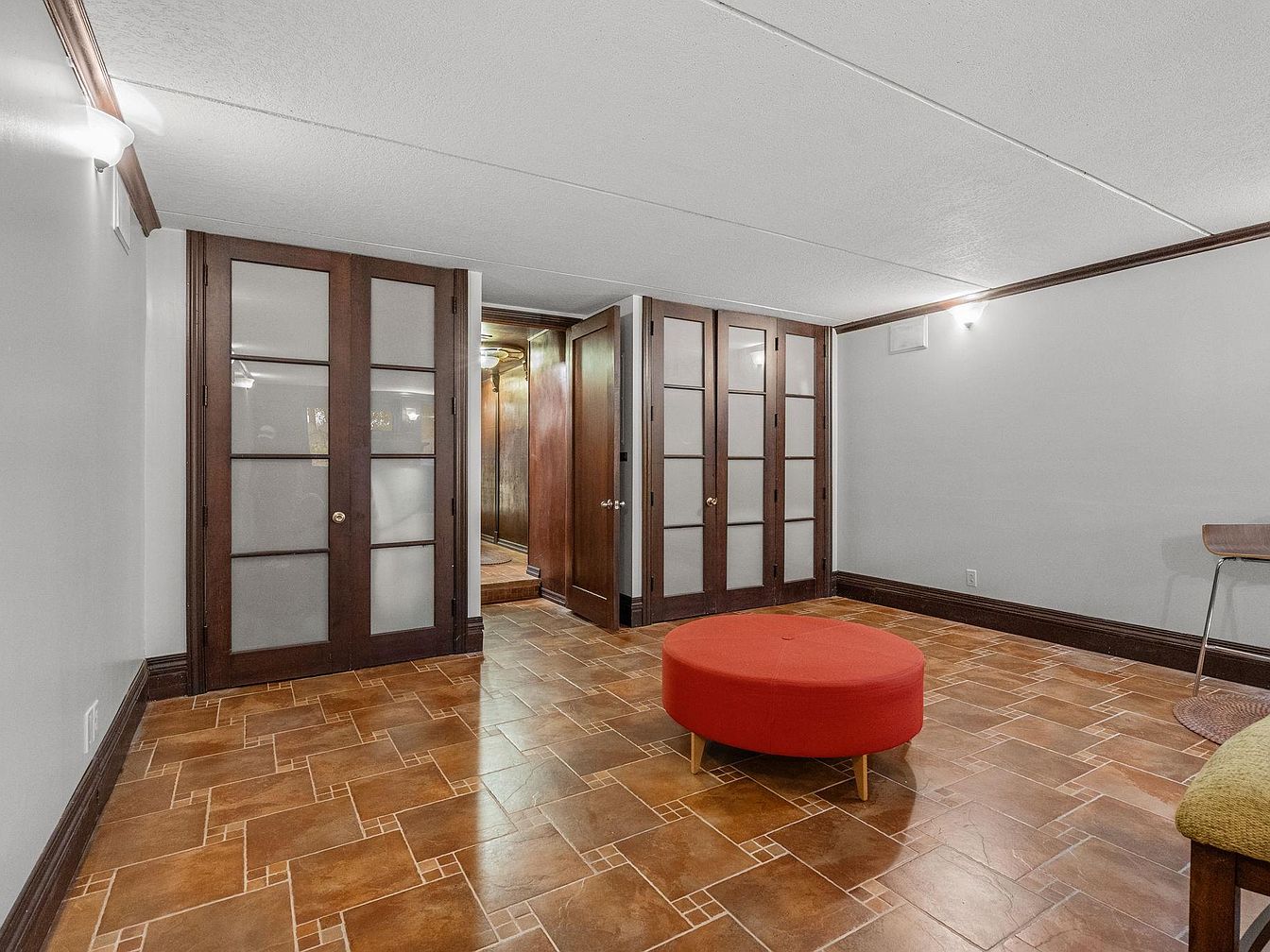 A spacious basement lounge with a warm and welcoming atmosphere, featuring earthy terracotta floor tiles arranged in an engaging geometric pattern. The room is adorned with frosted glass French doors and rich wood trim, lending a sophisticated touch that balances modern and traditional elements. Walls are painted a neutral soft gray, providing a clean backdrop for family activities or entertaining guests. The round red ottoman at the center adds a playful pop of color, encouraging gathering and relaxation. Ample open space is ideal for kids to play, while the practical tile floor is easy to clean—perfect for family living.
