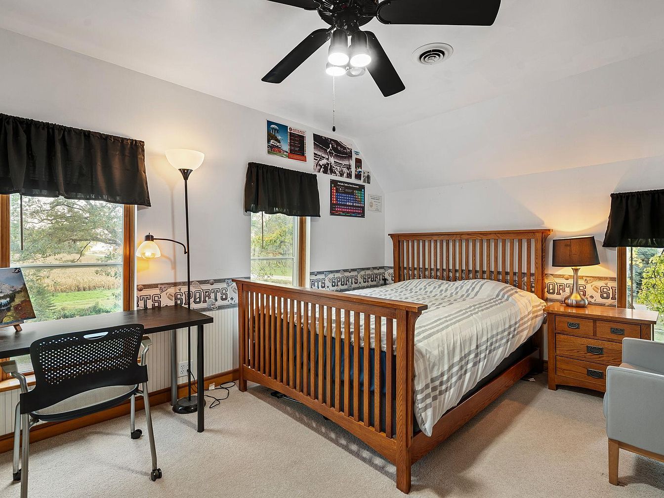 A welcoming and well-lit youth bedroom featuring a spacious wooden bed with matching nightstand anchors the space, enhanced by soft neutral tones and natural light pouring in through large windows. Black valances add a contemporary touch, while a practical study area with a sleek desk and ergonomic chair creates a dedicated homework zone. The soft carpet flooring and simple striped bedding provide comfort and style. Sports-themed wallpaper border and wall posters add a personalized, family-friendly atmosphere, making the room both functional and inviting for a growing child or teen. The ceiling fan ensures comfort year-round.