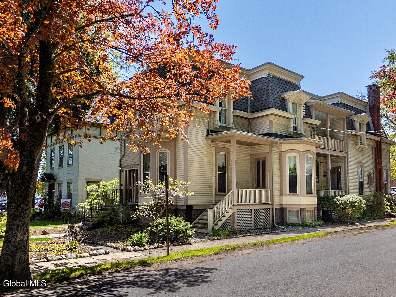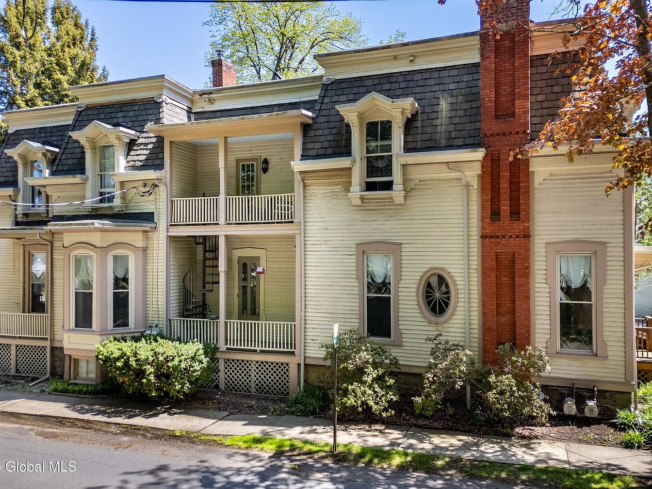 A charming Victorian-style home welcomes visitors with its intricate architectural details and inviting porch. The façade features tall, elegant windows framed by creamy siding, complemented by Mansard-style roofs and decorative dormers above. A small set of stairs leads up to a covered entryway, perfect for greeting guests. Lush landscaping with a stone-bordered flower bed and mature shade trees surrounds the property, providing a family-friendly space for outdoor play and summer gatherings. Subtle earth tones on the exterior enhance the warmth of the neighborhood, while multiple balconies and porches add character and offer cozy spots to relax and enjoy tree-lined street views.