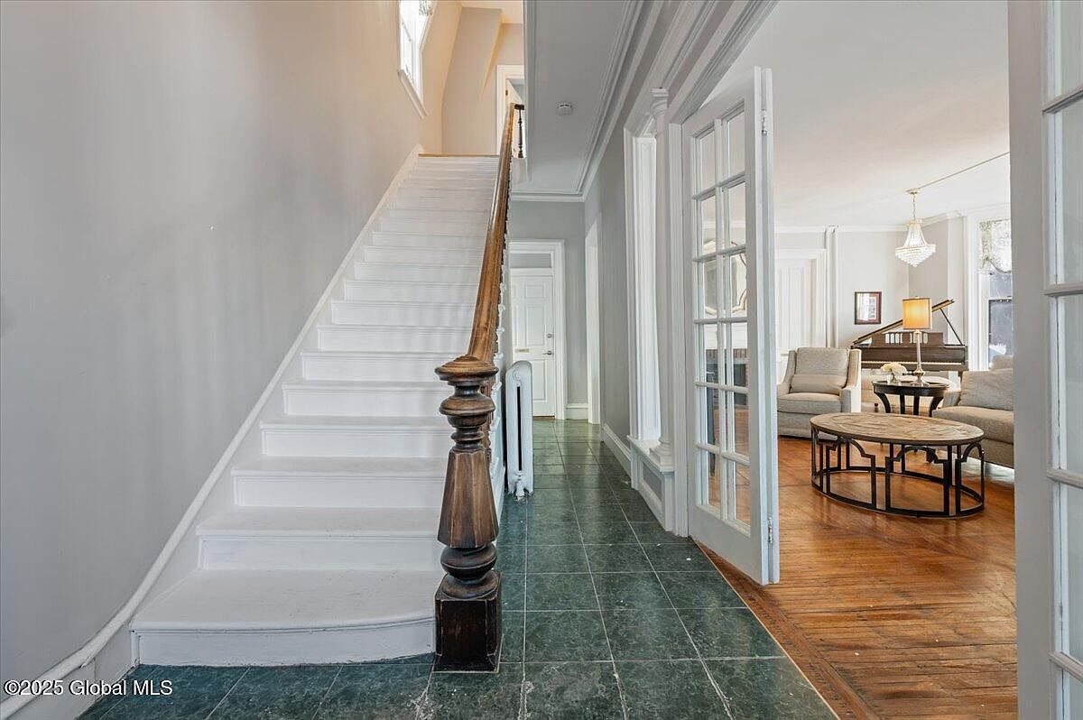 This welcoming entryway features a classic staircase with a rich wooden handrail and crisp white steps, providing a charming focal point against soft gray walls that create a soothing atmosphere. A wide-tiled dark green floor adds a touch of sophistication while ensuring durability for family foot traffic. Through bright French doors, the adjacent living room offers an open layout perfect for gatherings, with plush seating, a grand piano, and a sparkling chandelier for an elegant touch. Architectural details such as crown molding throughout offer timeless appeal, making this a versatile and stylish space for both everyday living and entertaining.