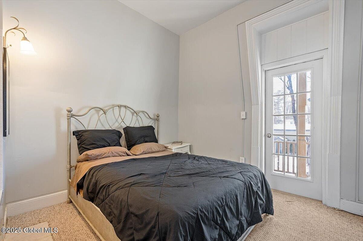 This welcoming bedroom features a soft, neutral color palette with light gray walls that create a peaceful atmosphere. A sculpted metal headboard adds a touch of elegance, paired with cozy black and taupe bedding for a modern yet warm aesthetic. The plush carpet underfoot offers comfort and is ideal for families with children. A classic French door fills the room with natural light and provides easy access to a balcony or patio, perfect for leisurely mornings. Minimalist furniture, including a small bedside table and an overhead wall sconce, completes the room’s simple, functional, and family-friendly design.