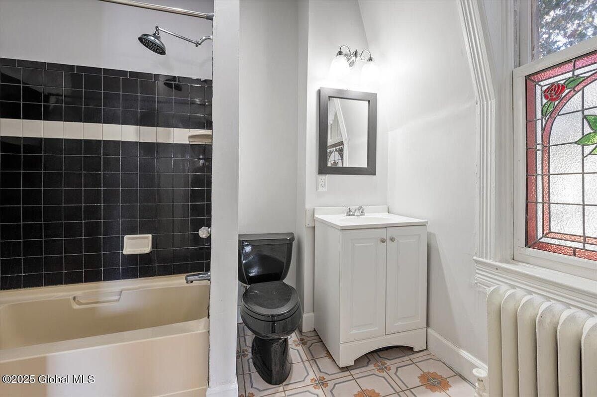 This thoughtfully designed bathroom combines modern and vintage elements to create a welcoming, family-friendly space. The bold black tile and tub surround contrast beautifully with crisp white walls and cabinetry, while a unique black toilet adds a contemporary touch. The vanity area features a white sink cabinet topped with a simple framed mirror, complemented by overhead lighting for a bright and functional nook. Patterned floor tiles introduce warmth with their decorative motif. The stained glass window infuses the room with character, softening the ambiance and providing privacy with style. Ample natural light and a classic radiator complete the inviting layout.